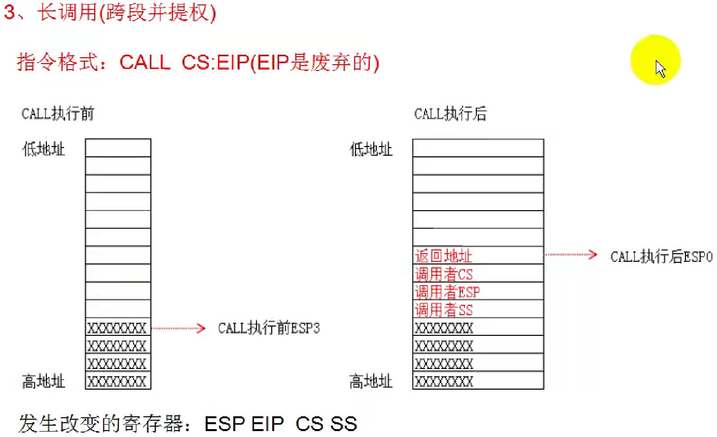 远调用 (Far Call) | 不同代码段 | 无 | 代码段 (CS)、返回地址 (EIP) | ESP = ESP - 8 |