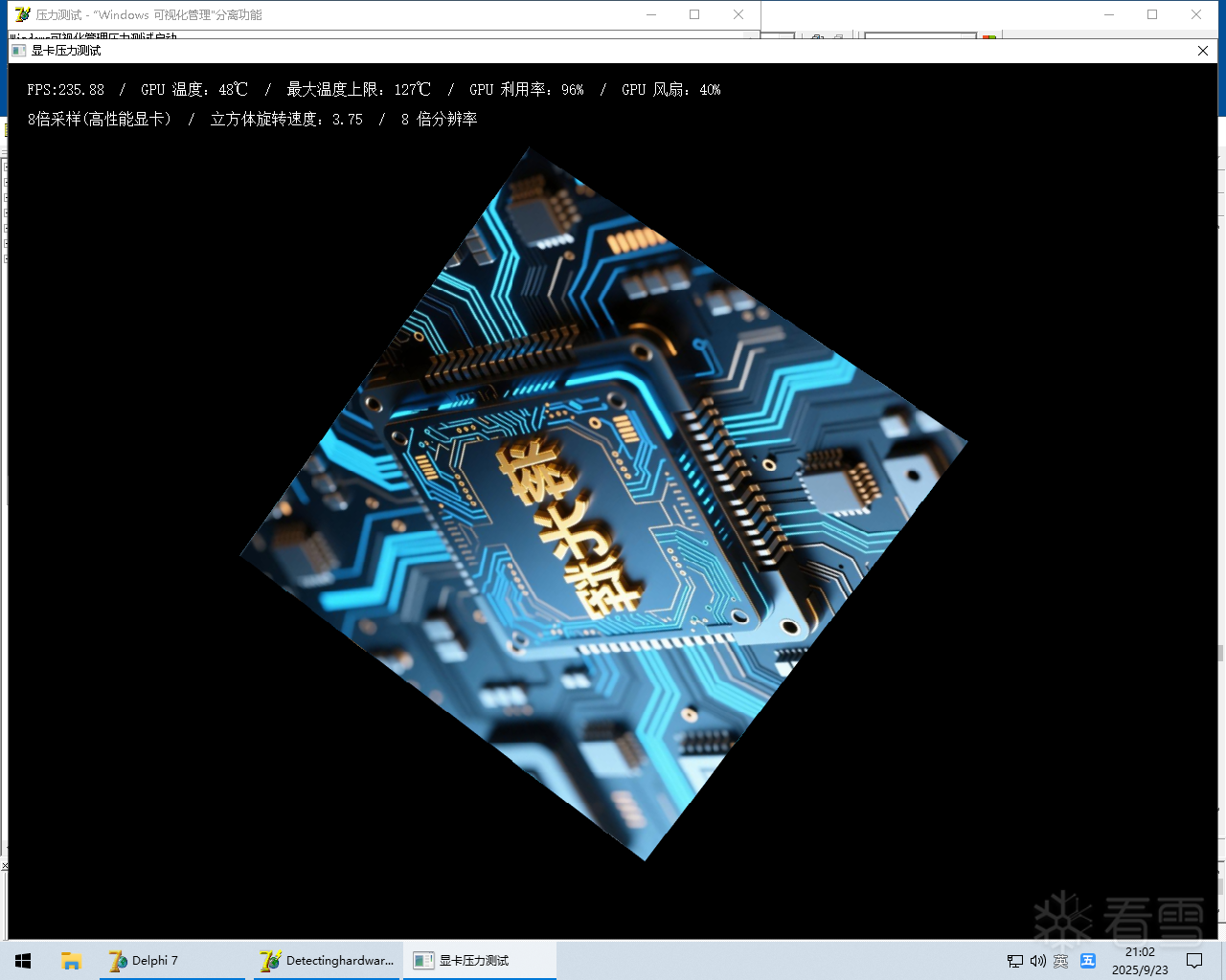 显卡压力测试,按设置.ini“GPU最大利用率”设置的,目前只在我本机测试过,以我本机的显卡,如果GPU最大利用率=98,可以自适应的跑到98%,如果设置GPU最大利用率=20,我本机测试,只能下降到25%,不能再降了,因为整个软件,就一个立方体(没有图片素材)加上客户要求是跑满的,我当时打算,如果高性能显卡,一个立方体不够跑满的,到时创建多个对像或窗口的,但客户这边没有测试,所以就不折腾了。