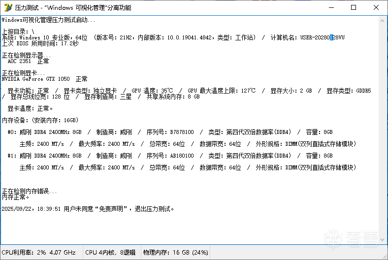 后来我又重新改成了压力测试(同意“免责声明”后才开始测试),保留了硬件问题检测,增加介面,让客户去测试,但客户这边一直没有测试,可能放弃了这个项目,因只收到300定金,这个项目做了一个星期(重做检测CPU利用率,浪费了二天),所以就放上来,给大家玩玩。因客户是想用在网吧,所以我没有加驱动检测CPU温度。