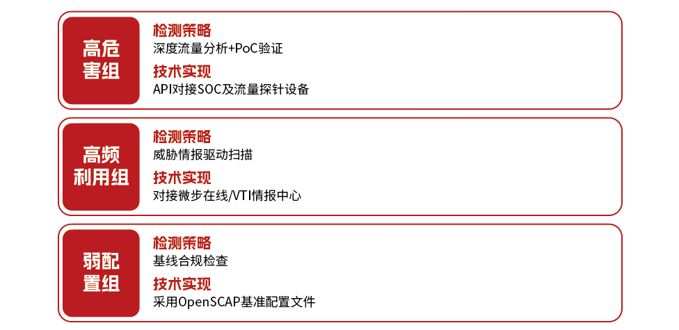 “精准聚焦、动态闭环”,围绕公安部对 “高危害漏洞、高频利用漏洞、弱安全配置”(两高一弱)的专项治理要求,构建“检测-评估-处置-验证”全流程闭环体系,以漏洞检测组为核心策略单元,实现“一类漏洞一套策略”的精准化检测能力,确保符合《网络安全漏洞管理规定》及《关键信息基础设施安全保护条例》要求。