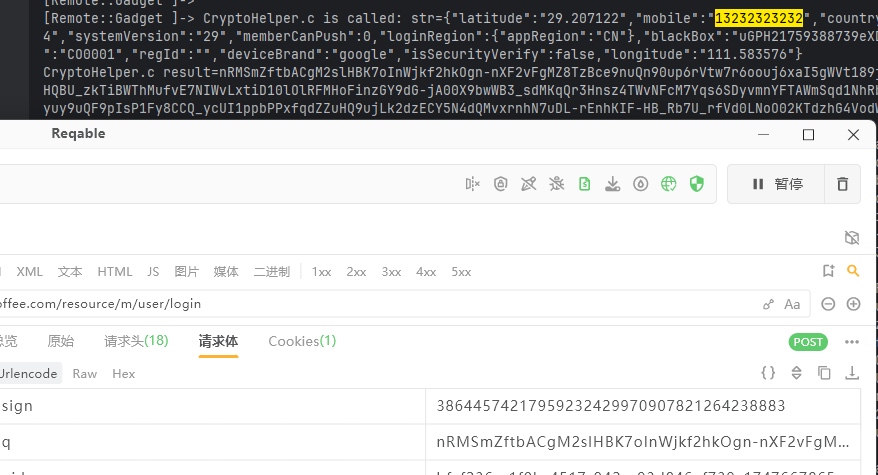 这个看起来像是登录提交参数 那很可能是加密明文 于是对信息过滤有手机号 打印堆栈得到以下信息