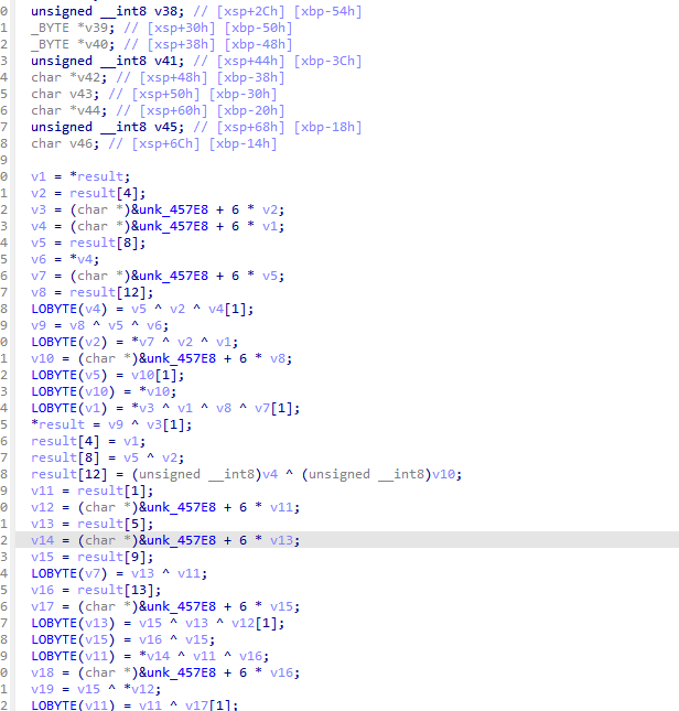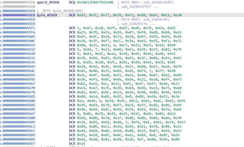 这个函数 我们阔以看到有个byte_455E8 它频繁的从里面取了值 我们去看看byte_455E8 这不是s盒吗 看这个操作从s盒取值 然后后面又赋值给result 符合我们AES里面的SubBytes 操作 那不问ai了 继续往下看 223E0
