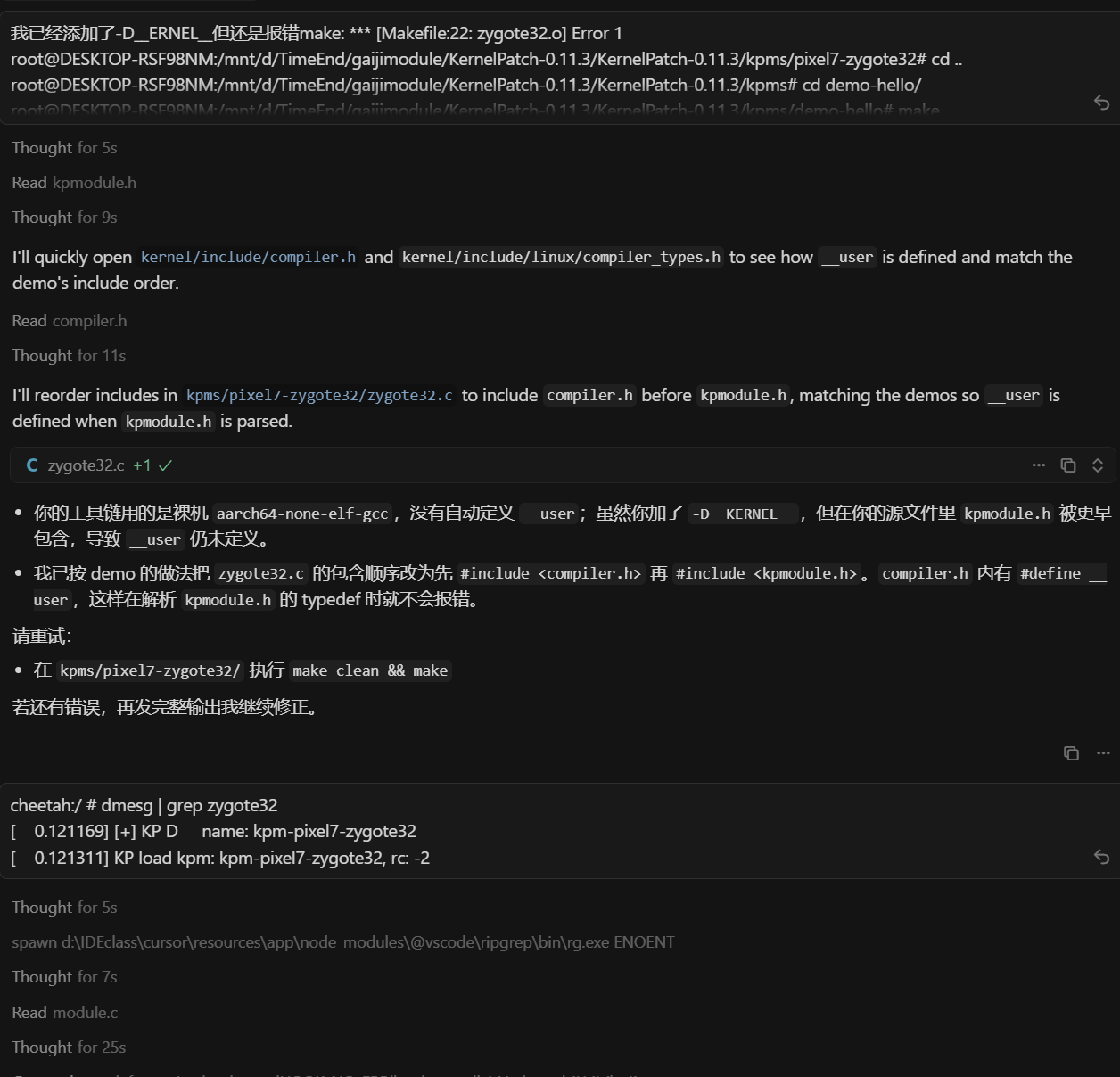 直接选择把上文作者的代码投喂给了cursor,然后生成了第一版,make时产生了报错,这个交由了AI再进一步分析,他很轻便地就解决了这个报错。