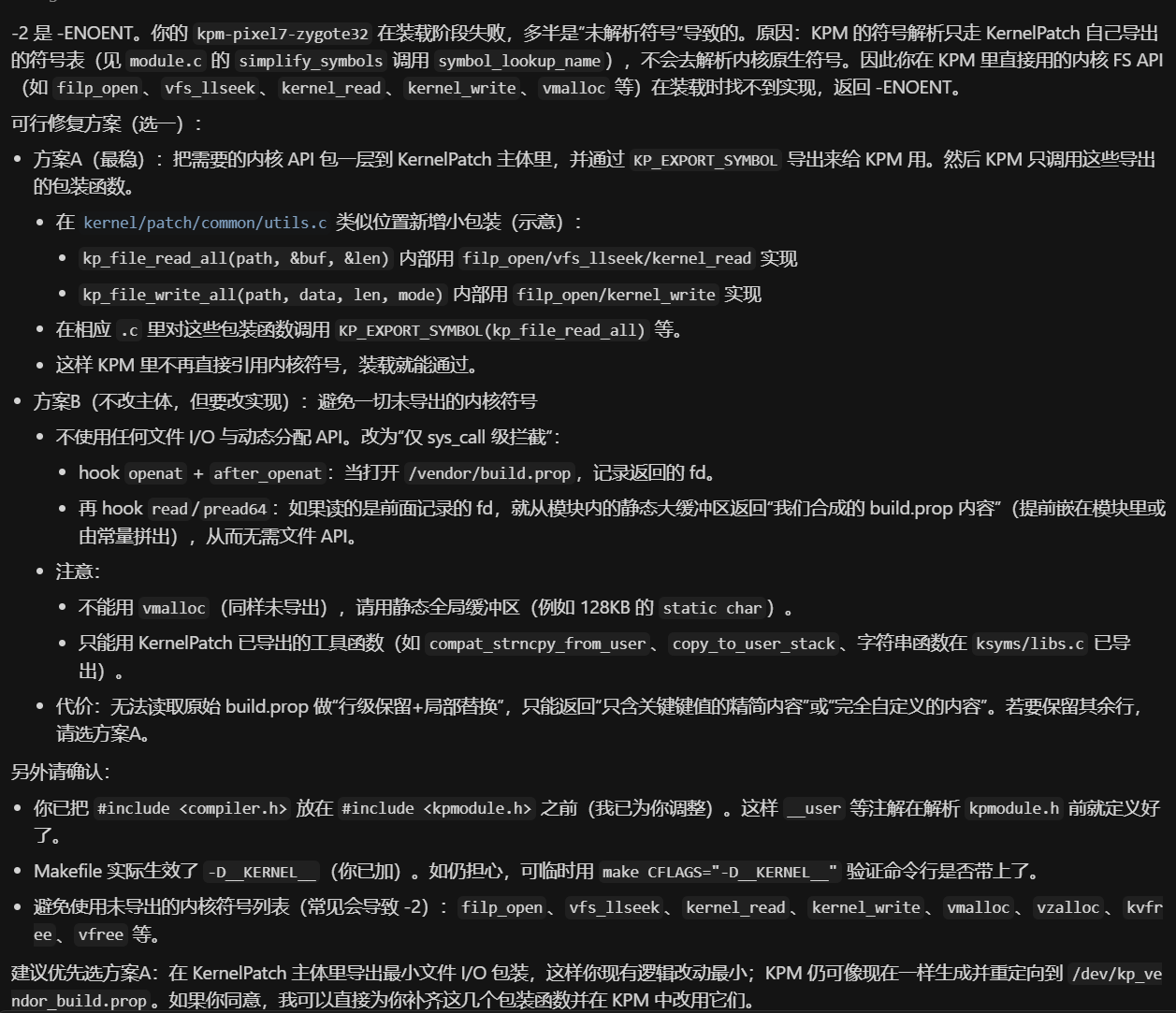 此处之前稍微阅读过kernelPatch的源码,了解过他有去获取内核API的方式,最终将kallsyms_lookup_name函数提示给AI去做了修正,再次编译后基本就无误了。