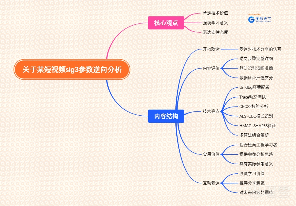 这篇逆向教程相当接地气!Unidbg实操+trace追踪+三算法实战环环相扣,我整理的思维导图把分析流程可视化,值得收藏细读。