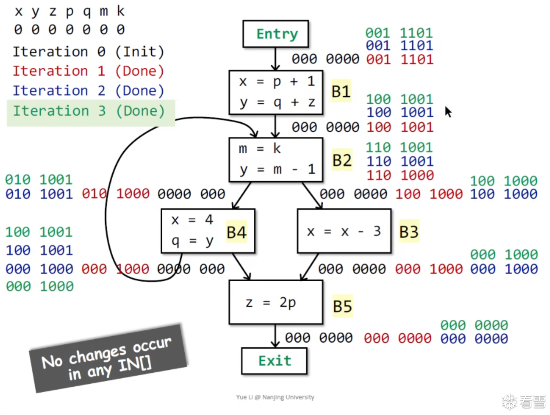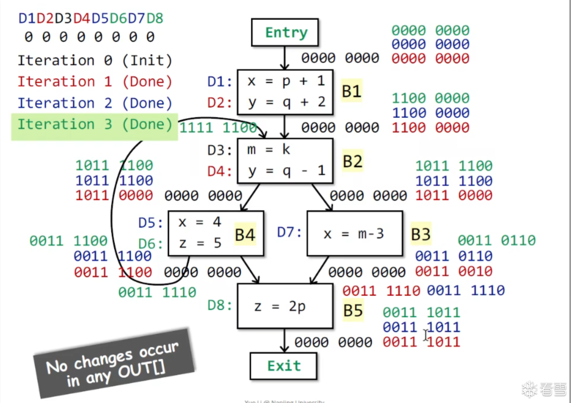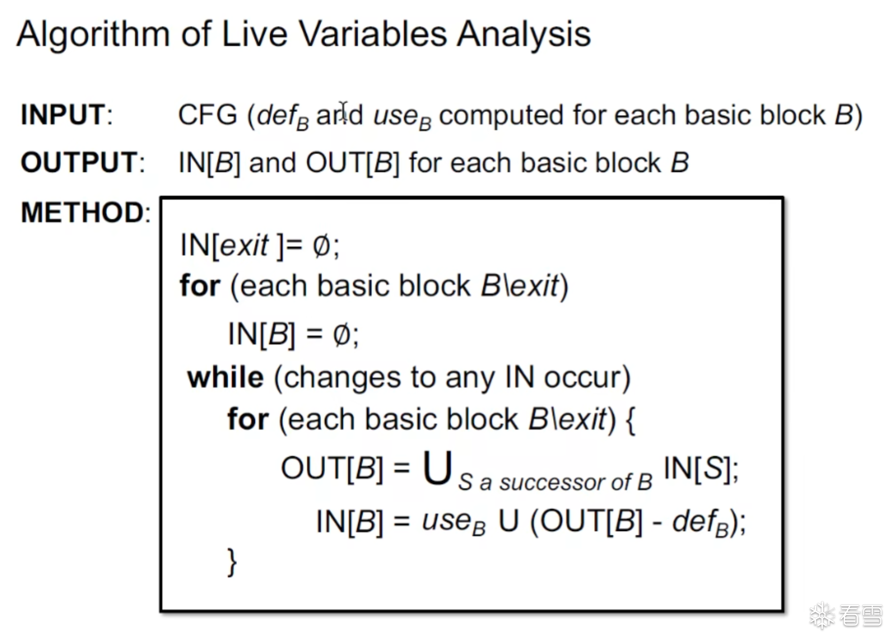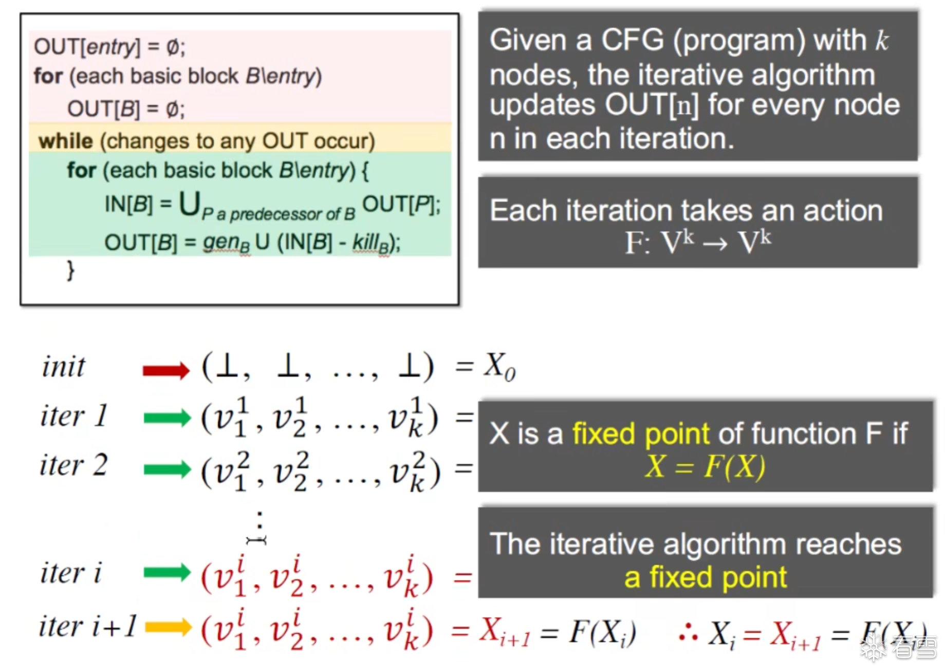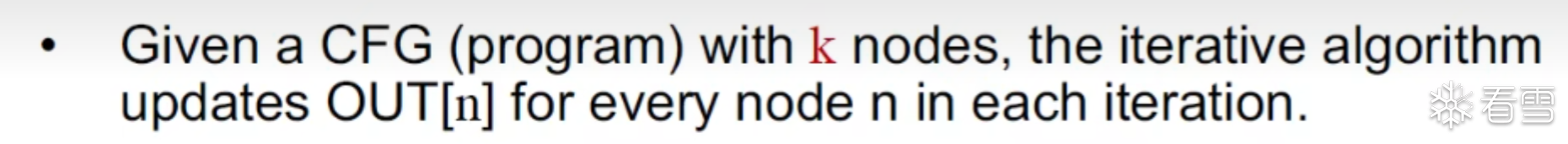对于给定的CFG图有K个节点这个迭代算法就是在每次循环的时候更新所有节点的OUT[n]