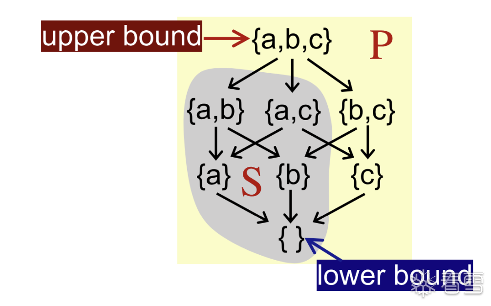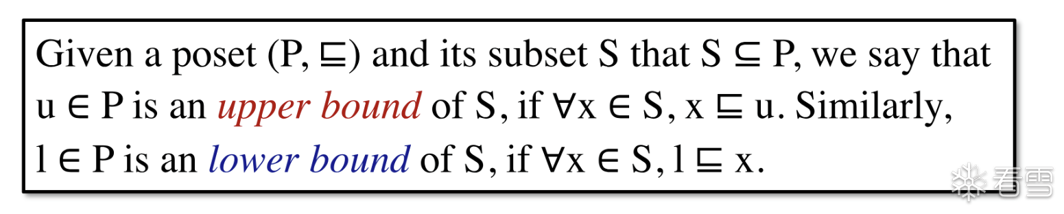 给定一个 poset P 和他的子集S 如果在 P中存在一个元素u满足S中的所有的元素都小于(偏序关系) 这个元素 u则称该元素 u是 集合S的 上界,值得注意的是这里的元素u 必须 对于子集S 全部 compareble.