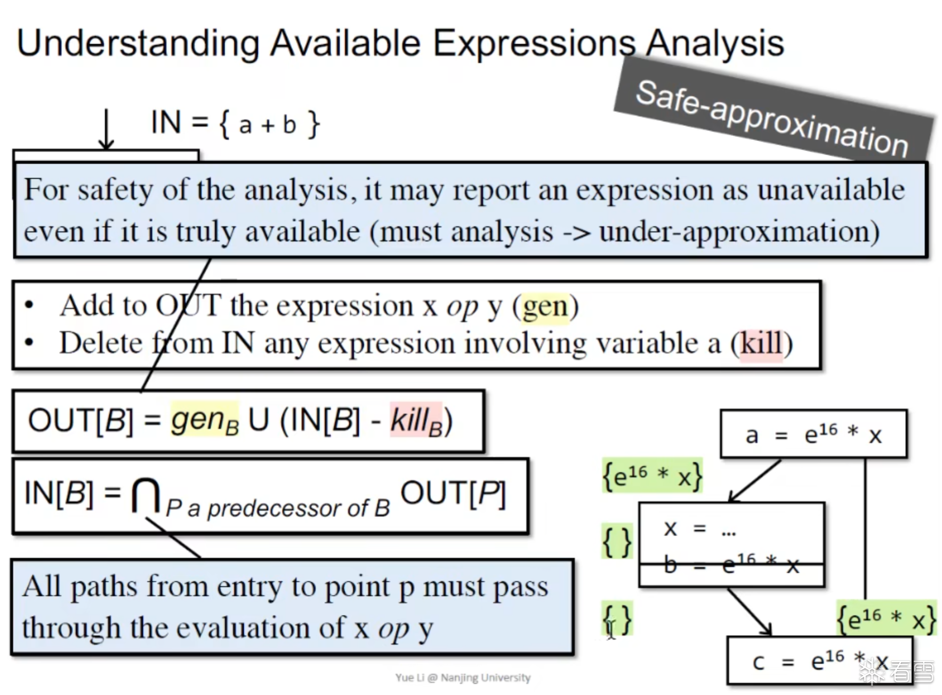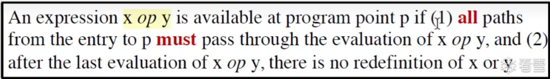 一个表达式 a + b 在程序点 P 可用 (Available) 需要满足: