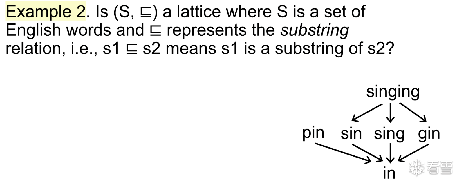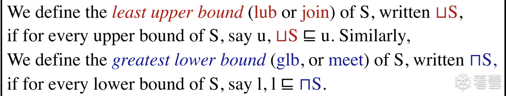 给定一个 poset P 和他的子集S 如果在 P中存在一个元素l满足S中的所有的元素都大于(偏序关系) 这个元素l则称该元素 l是 集合S的 下界,值得注意的是这里的元素u 必须 对于子集S 全部 compareble.
