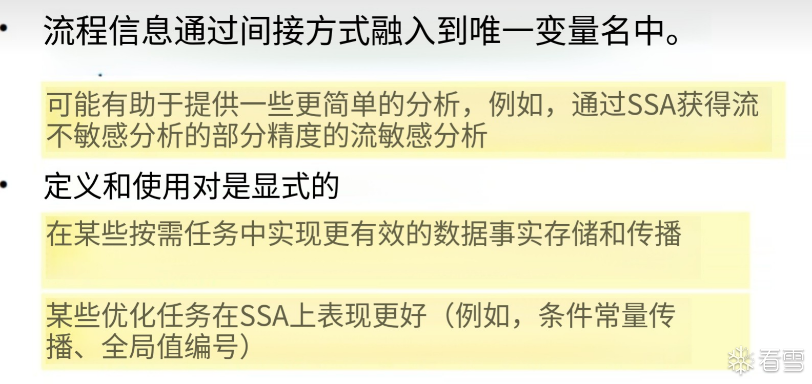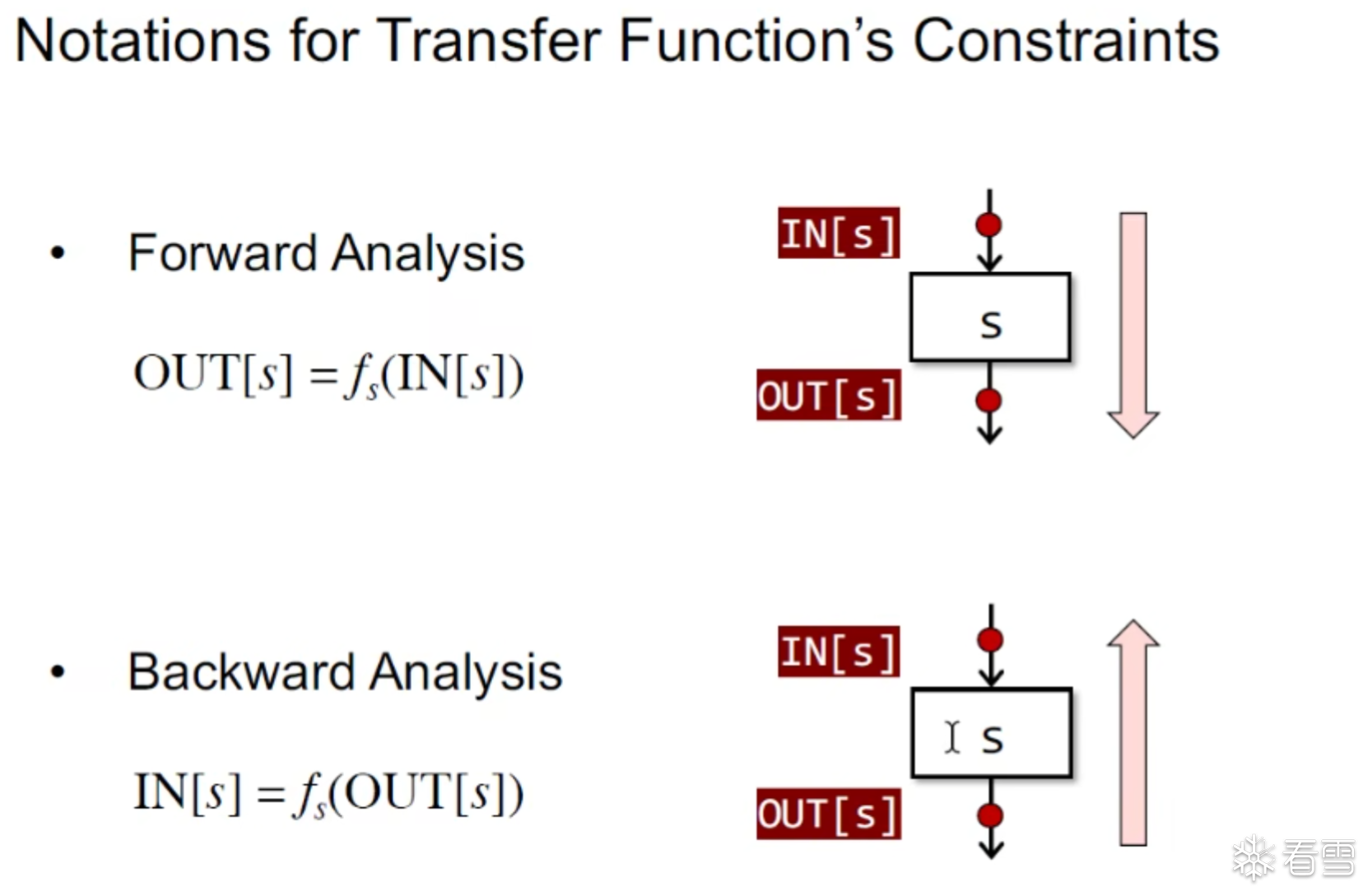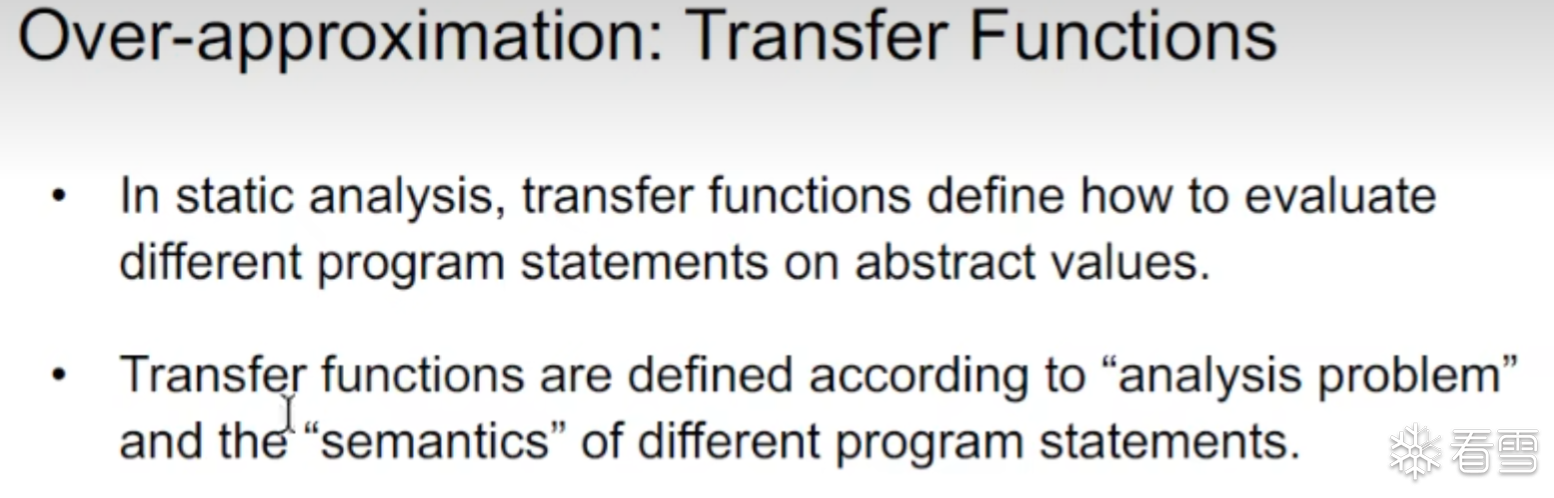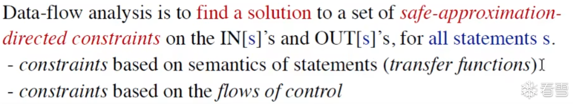从另一角度来说 数据流分析 就是通过 解 安全近似 在 IN[s]和OUT[s]的约束规则该约束规则作用于全部statements. 我们不断的解转换函数和控制流信息的约束规则就能得到一个解,这个解就会给每个程序点标记上抽象的flow的值