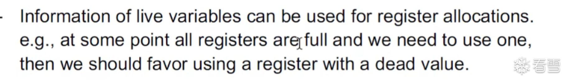 可以将这个技术用在寄存器分配上,当我们的寄存器满了之后就可以替换一个死变量,从而不浪费资源。
