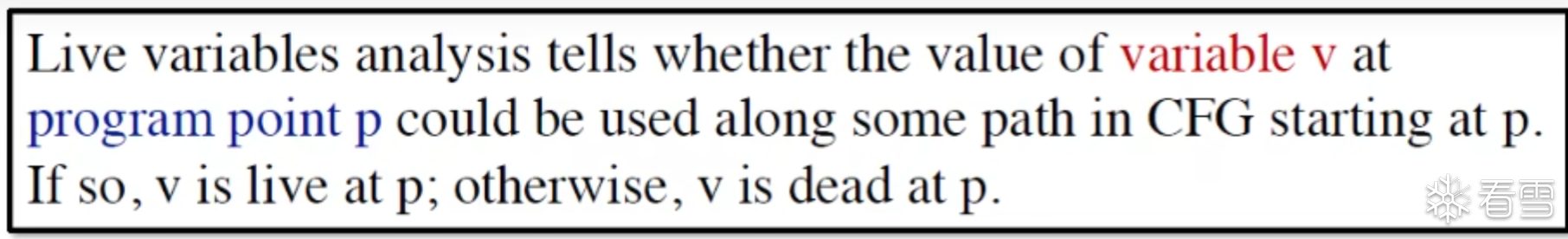 活变量分析是可以让我们知道在P中一点 的一个变量v是否能够在P该点之后进行使用,如果可以则证明该变量是活变量否则为死变量。