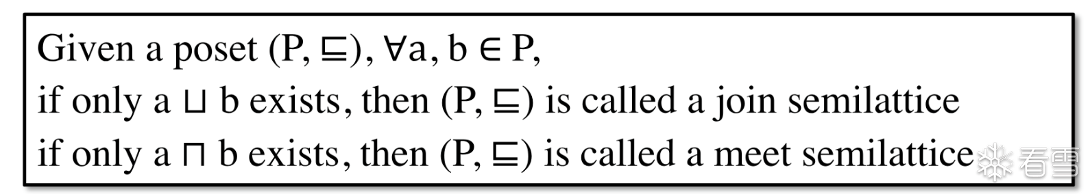 对于一个poset 如果 只有一个glb 或者只有一个lub 则称之为semilattice 半格