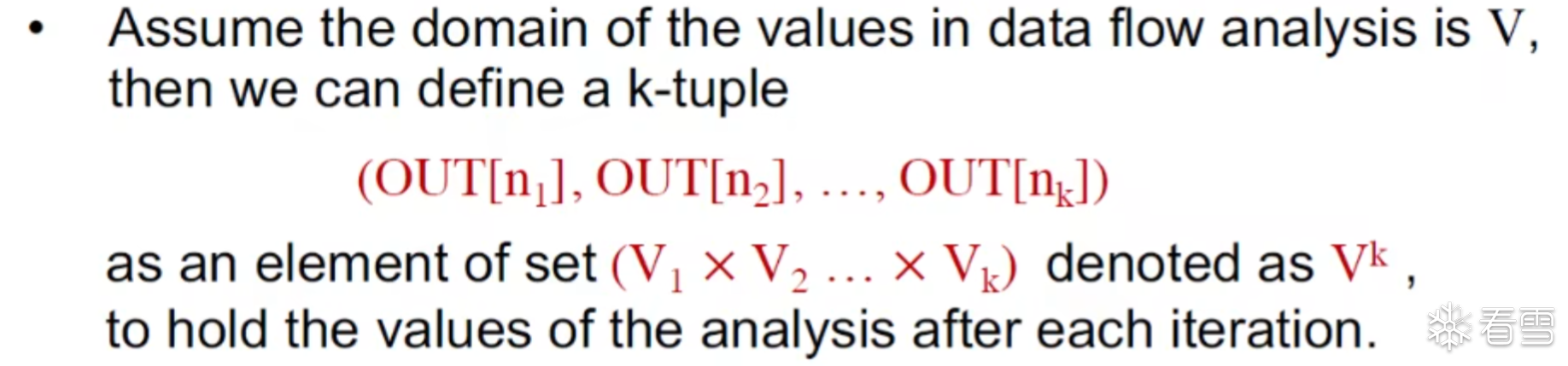 这里我们假设数据流分析中的值的抽象的域为V,我们就能定义一个K Tuple,其中每一个元素的值域为V1到VK 对于这个set的总值域为 V的k次方 记作 Vk