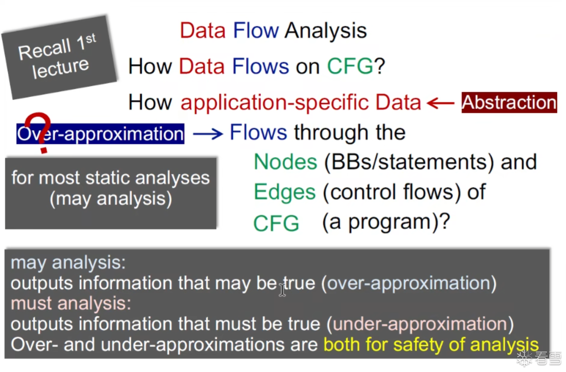 对于可达性分析的这里的分析类别应该是 may-analysis, 比如在程序中有100条path 其中有一条是没有初始化的path 我们应该用over-appro 去进行近似以便于将其归纳到报错当中去。