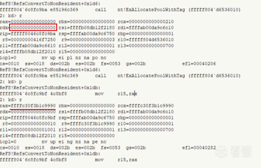 我们现在重新回顾RefsAddAllocationForResidentWrite漏洞所造成的效果:通过64位截断绕过了常驻阈值的检查,然后用32位值去更新scb的AllocationSize;经过调试发现即使WriteFile返回了错误,AllocationSize也没有被回滚。