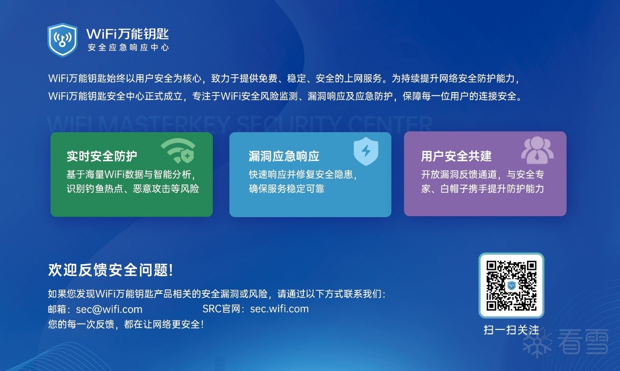 安全中心将专注于三大核心职能:依托海量WiFi数据与智能分析技术,实现实时安全防护,精准识别并预警钓鱼热点、恶意攻击等网络风险;建立高效的漏洞应急响应机制,确保对潜在安全隐患的快速发现与修复,保障服务持续稳定可靠;同时,秉持开放共建理念,携手用户与安全社区,通过开放的漏洞反馈渠道,汇聚安全专家与白帽子的力量,共同提升整体防护水平。WiFi万能钥匙将持续投入,坚定不移地守护每一位用户的连接安全。
