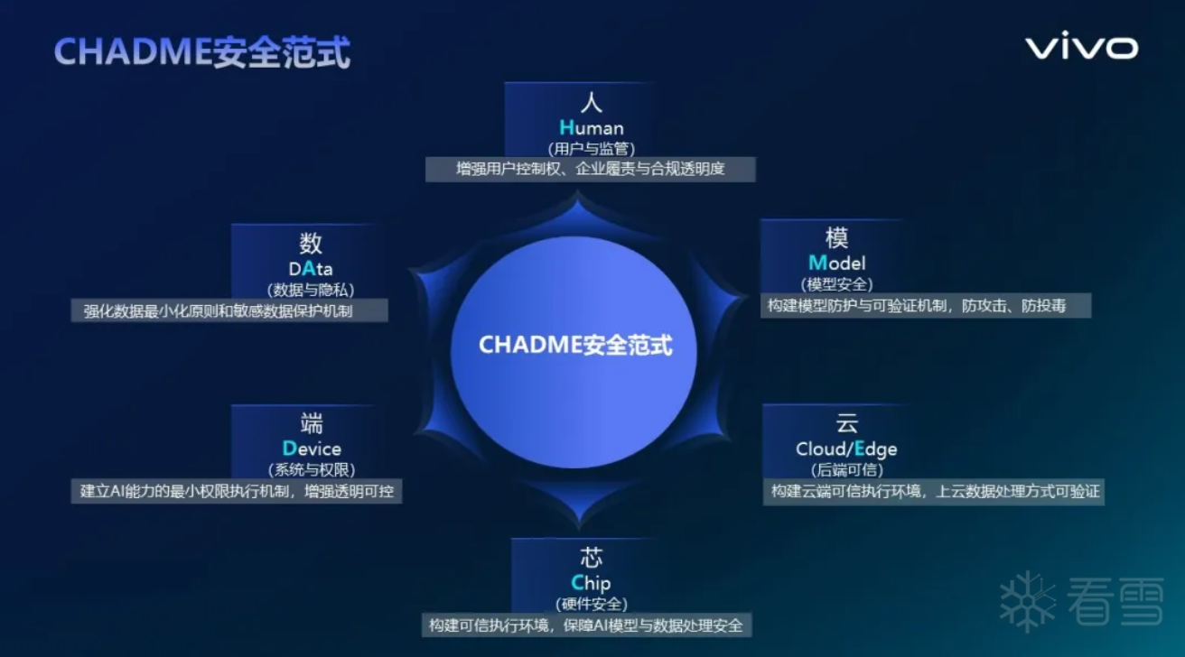 vivo提出CHADME六维安全范式—从芯片(Chip)、端(Device)、云(Cloud/Edge)、数据(Data)、模型(Model)与人(Human)六个维度出发,贯穿AI的全生命周期,从硬件可信根到模型可验证机制,再到用户控制权和企业履责,构建起覆盖AI能力全生命周期的安全闭环。