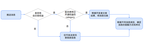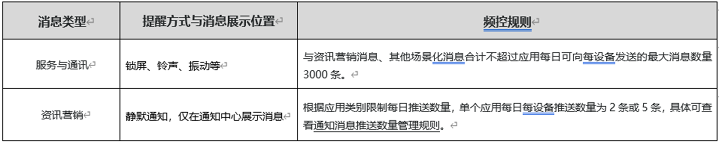 推送服务结合应用的消息内容和消息发送场景,将通知消息分类为服务与通讯类和资讯营销两大类别,并对不同类别的通知消息的提醒方式、消息展示位置、推送数量进行差异化管理。