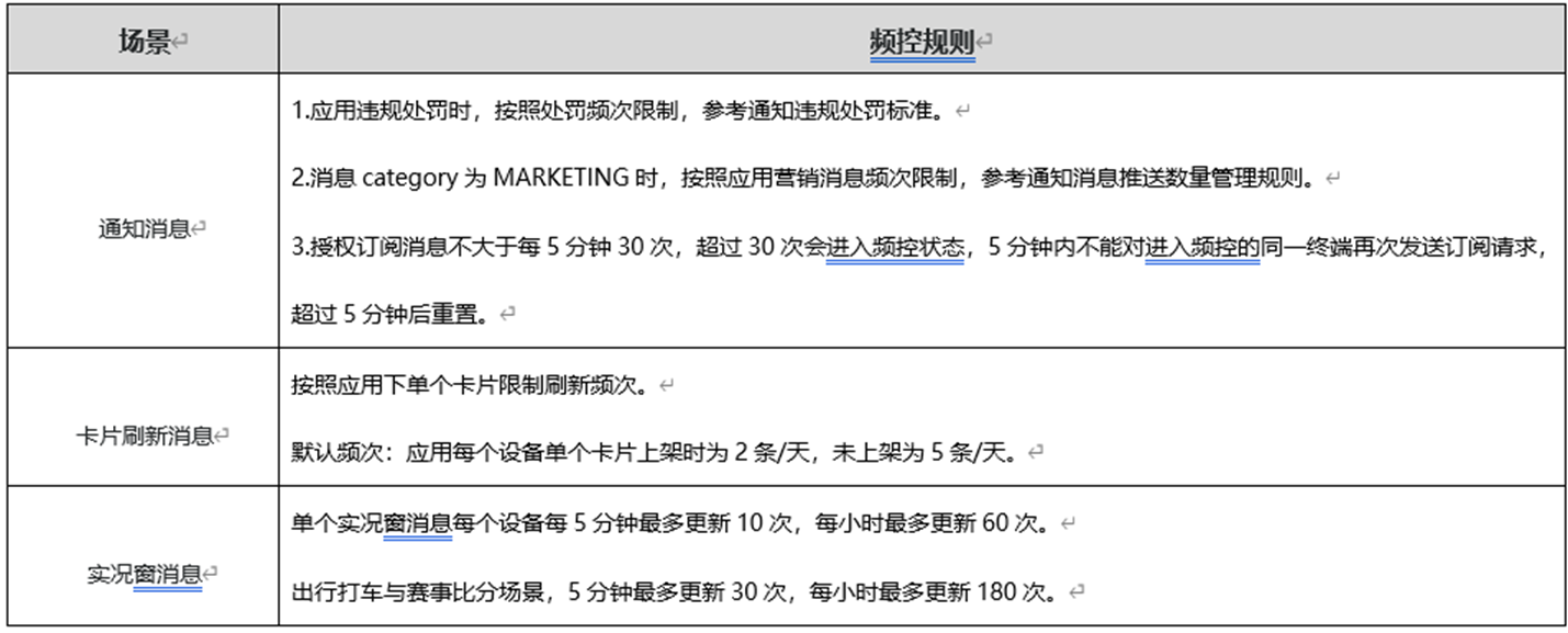 这里针对其中三种场景化消息进行了频控限制,包括通知消息、卡片刷新消息和实况窗消息,其中通知消息中包含了授权订阅消息。