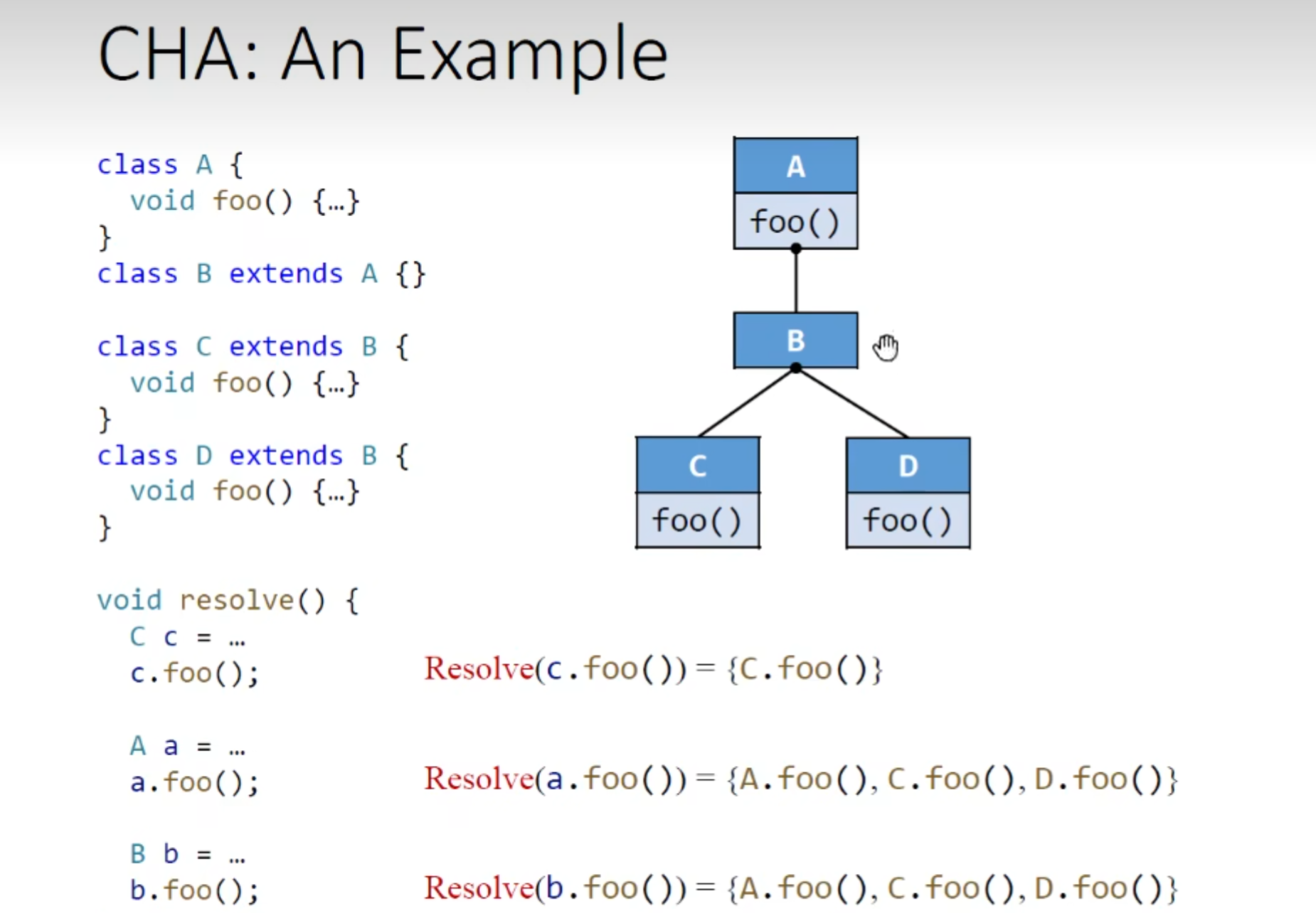 回溯到A类的 A.foo() 上面去。且一定记住CHA算法只考虑声明类型不考虑右值的实际类型