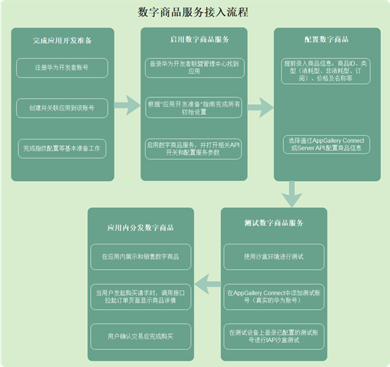 当前支持在开发者的应用内展示和分发数字商品,在完成数字商品配置和接入数字商品购买能力后,当用户在开发者的应用内发起购买时,应用需要调用相关接口来拉起订单页面,展示商品名称、商品价格等信息,用户可在确认交易订单后完成商品购买。