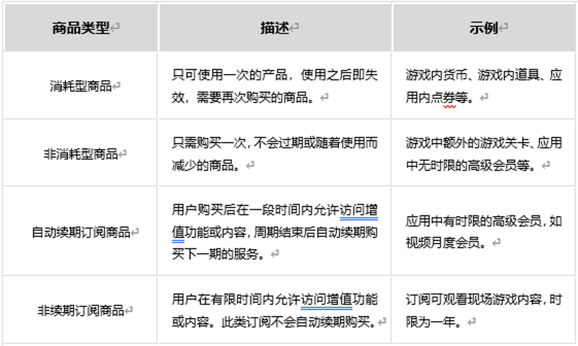 在应用购买场景中,用户会以一次性付款方式购买消耗型商品或非消耗型商品。请结合实际业务场景选择对应的商品类型。