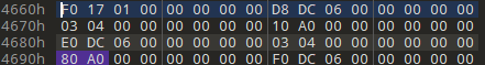 把数据转成16进制是F0171、80A0、10A0,在010中搜索,发现他们的位置在4660