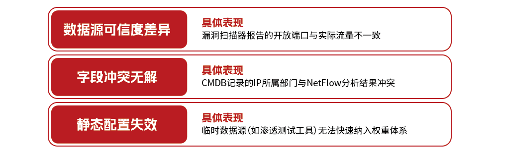 定义采集源级别权重(如CMDB权威性权重>被动扫描权重)