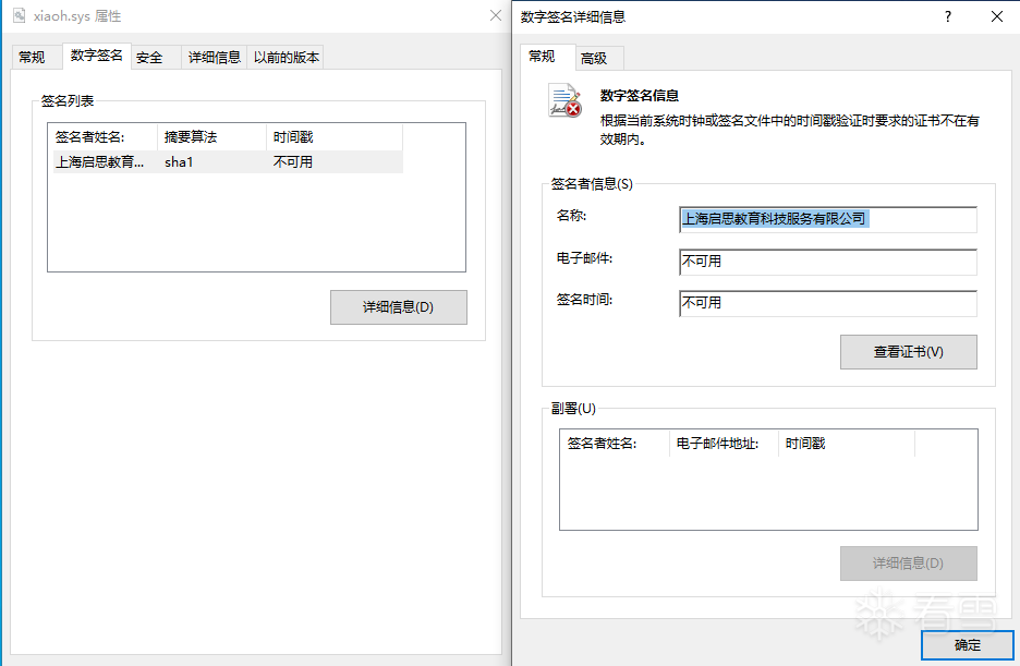 XiaoH.sys含有上海启思教育科技服务有限公司的过期数字签名: