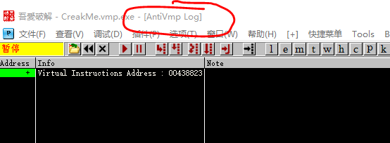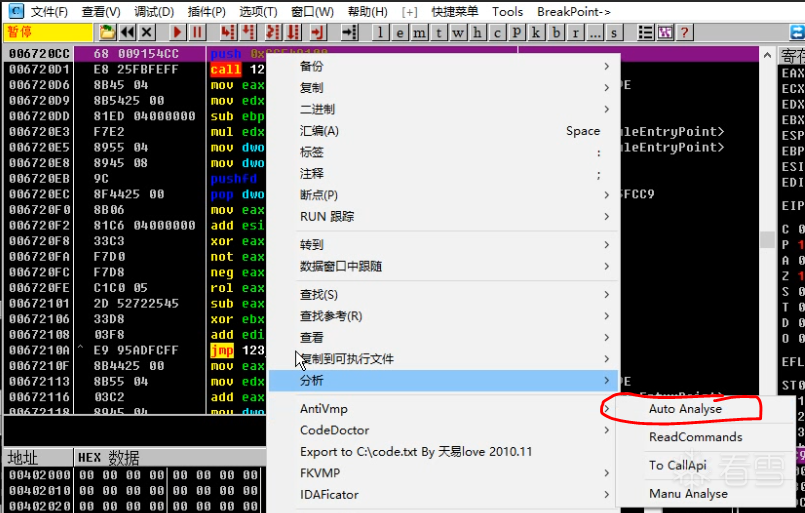 这里就是插件的分析起点,直接右键AntiVmp-》Auto Analyse。这个选项是自动分析,他会分析整个流程块,我们也可以在某个地方下断点,那么他就会分析到断点的地方停止,分析过程中底下会有分析进度显示,如果分析的代码块指令过多,时间会比较长,当然分析的指令数量也是有一定限度的,这里我已经设置满足大多数情况了,这里分析并不是和以往的插件一样,静态分析,这里是先Trace记录数据,记录完成再进行分析,没分析完成之前不要操作OD,有可能会卡主,或者闪退,这里可以多打开一个OD,结合前面分析的代码,自己去调试,分析完成之后后如果没有出现这个