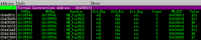 这里总共有10列,分别是handler的地址,再讲第二个含义之前我先解释一下,三个轮转的寄存器,分别是ebp,esi,DispatcherReg。这里的ebp是根据2.x版本得出的,在他之前ebp寄存器始终都是用于存放临时变量的相当于esp,esi用于存放伪代码指针,DispatcherReg是3.x版本开始有的,这里刚好edi可以用,那么esp始终指向虚拟寄存器块,在这个版本这三个寄存器过段时间就会轮转,所以我们分析的时候,首先要确定他们的职责,介绍完了,我们看第二列就是handler执行前ebp的值,第三列是执行后的值,第四列是handler名称,第五六七列就是前面说的这三个寄存器现在对应的寄存器,第八列是这条handler执行前,前面执行了多少次,这对于定位代码非常有用,记得以前分析2.x版本的时候一条handler可以对应多个伪代码,是一对多,现在是多对多,执行同一个功能的handler可以有好多个,第九列就是对应伪代码的地址了,第十个是解密出来的虚拟寄存器编号或者常数的值。前面说了这个寄存器轮转就发生在VM_JmpEntry这个handler里面,从名字我们就可以看到他其实是以前的VmEntry,也只有VmEntry才对寄存器进行重新分配,还有一个VM_JmpEntry2,这个handler是镶嵌在VM_JmpEntry里面的,但是他的起始地址是在,举个例子