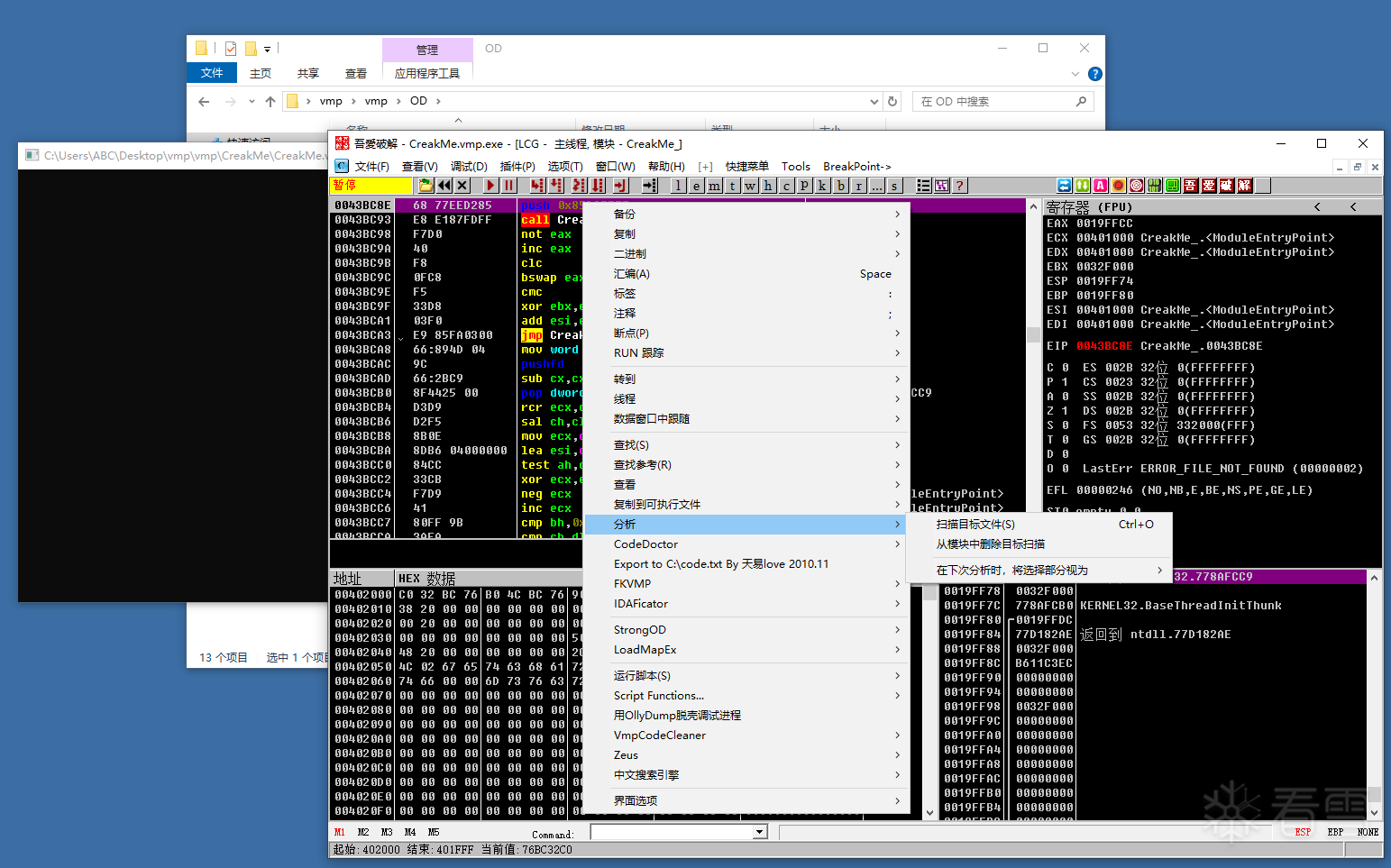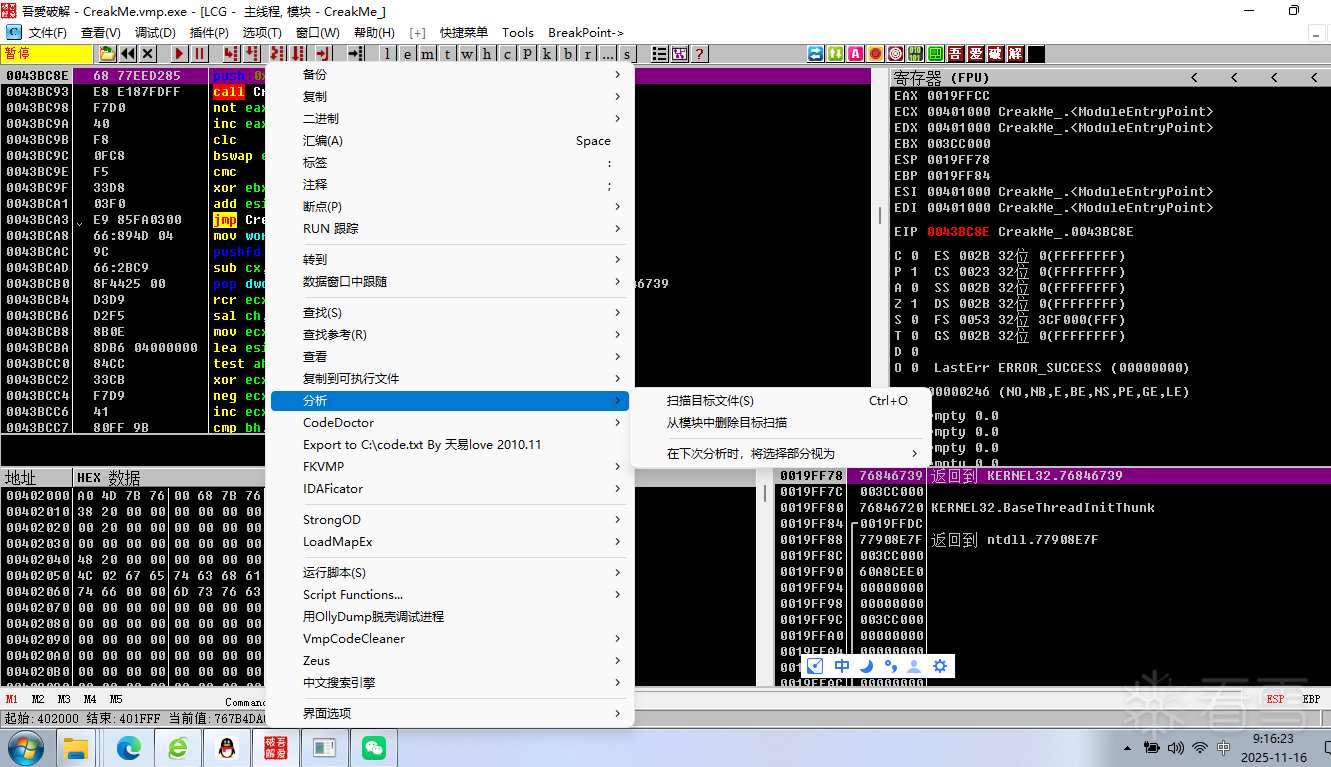 我们再讲第二个样本test拖到OD里面,这个是反调试外壳,当然这个外壳也是被vm了,而且体量非常大,这个反调试外壳,并不是所有代码都vm,我们按照前面一样右键分析,分析完成之后我们转到代码界面,这时候很显然是正常代码但是加了很多垃圾代码,这边我们可以正常去分析,当然用不了多久,他又进入vm了,这里如果我们不想看这段没被vm的正常代码,可以使用执行到返回,再单步,进入到下一个分析起点,之后可以再右键分析,但是不建议这么做,为什么呢,这也是我们百思不得其解的地方,会偶尔莫明奇妙的闪退,如果是分析的代码量巨大就不要连续使用分析功能了,记住或者下断下一个分析起点,把OD重开,在运行分析,否则会因为内存不足大概率闪退,如果我们想将结果保存,可以在分析的日志界面,右键-》复制到粘贴板->整个表,这样子我们可以在记事本上慢慢的分析。