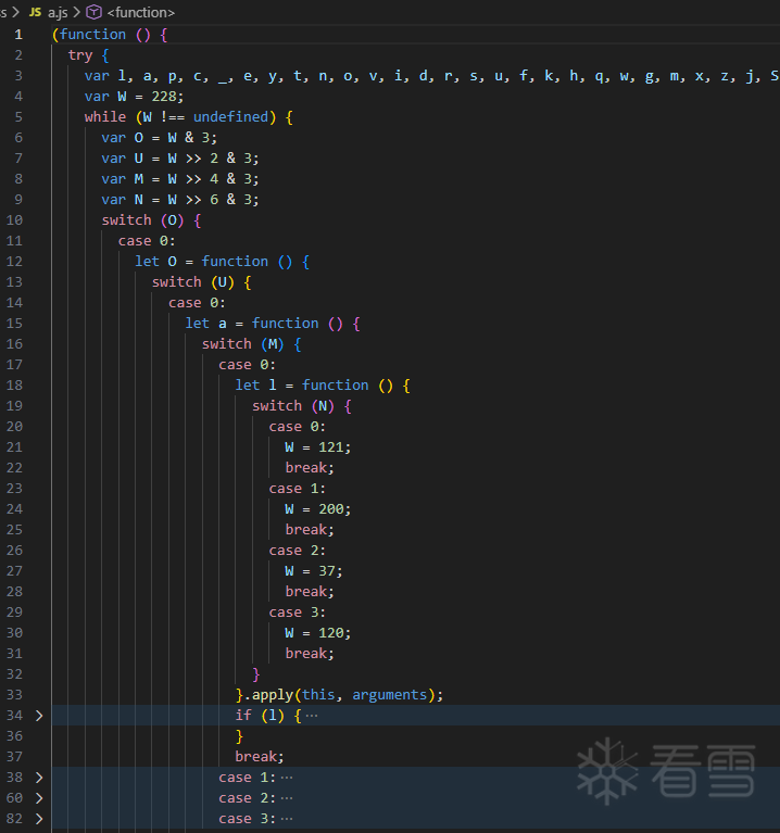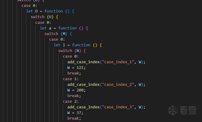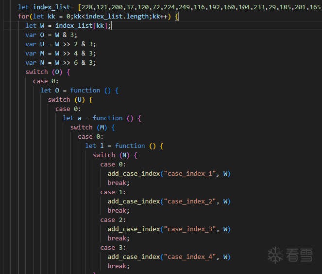 将js文件复制出来就可以看到整个混淆过后的js代码了。初步分析整个代码,选每一层的第一个switch和第一个case展开后开始分析,最内层的case代码运行后会一层一层的break返回最外层,而不会在中间的某一层停留,同样的如果最内层有return,那么也会一层一层的返回到最外层,而不会在中间层处理。那么可以认定整个switch由最外层的参数控制,可以将整个switch处理成只有最外层参数的一层switch.