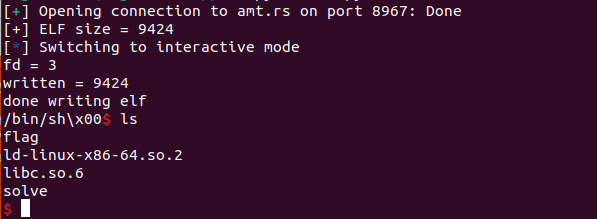 accepts an uploaded ELF binary from the player, saves it to /tmp/solve, and runs it inside a strict seccomp sandbox that only allows a few system calls.
