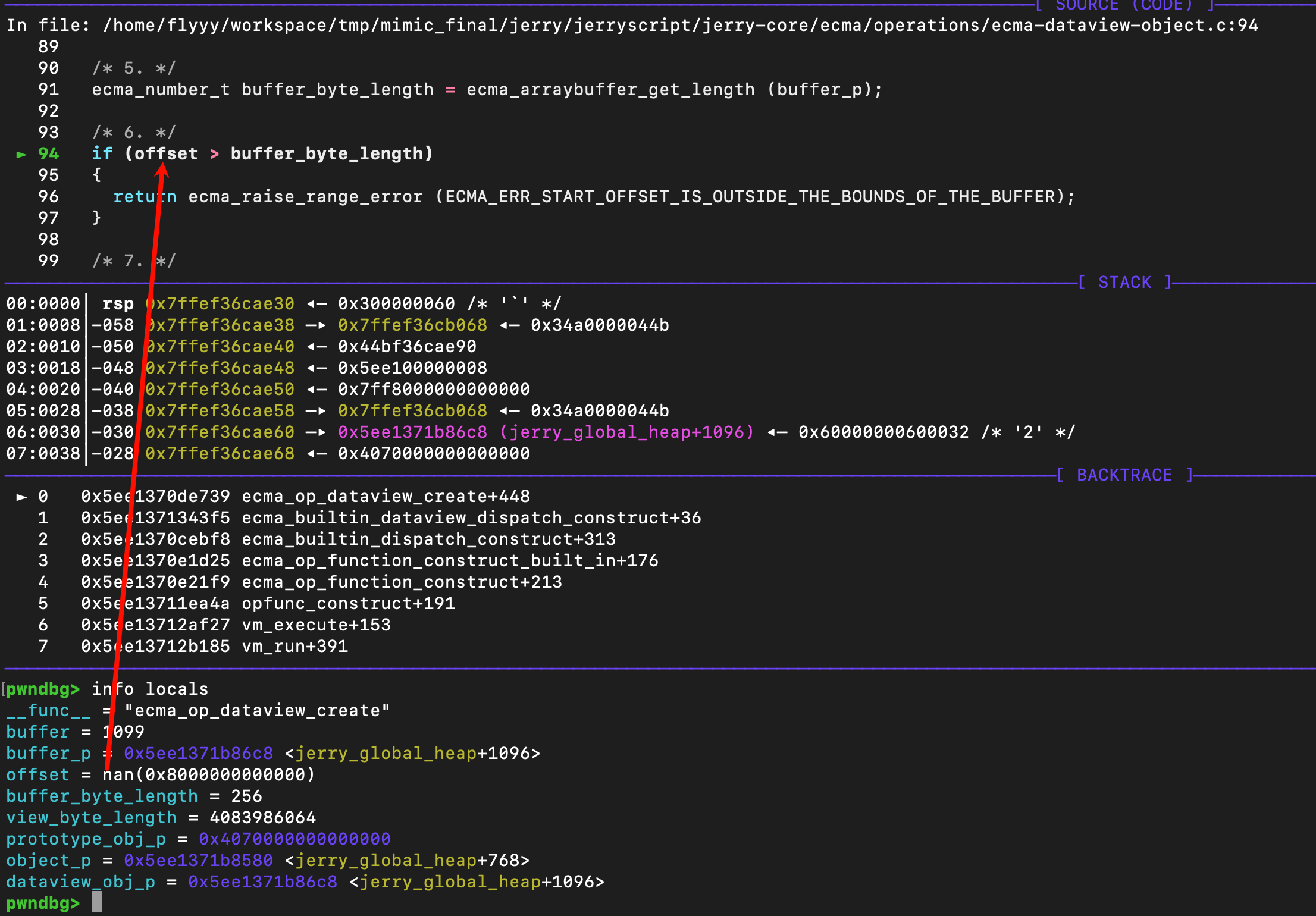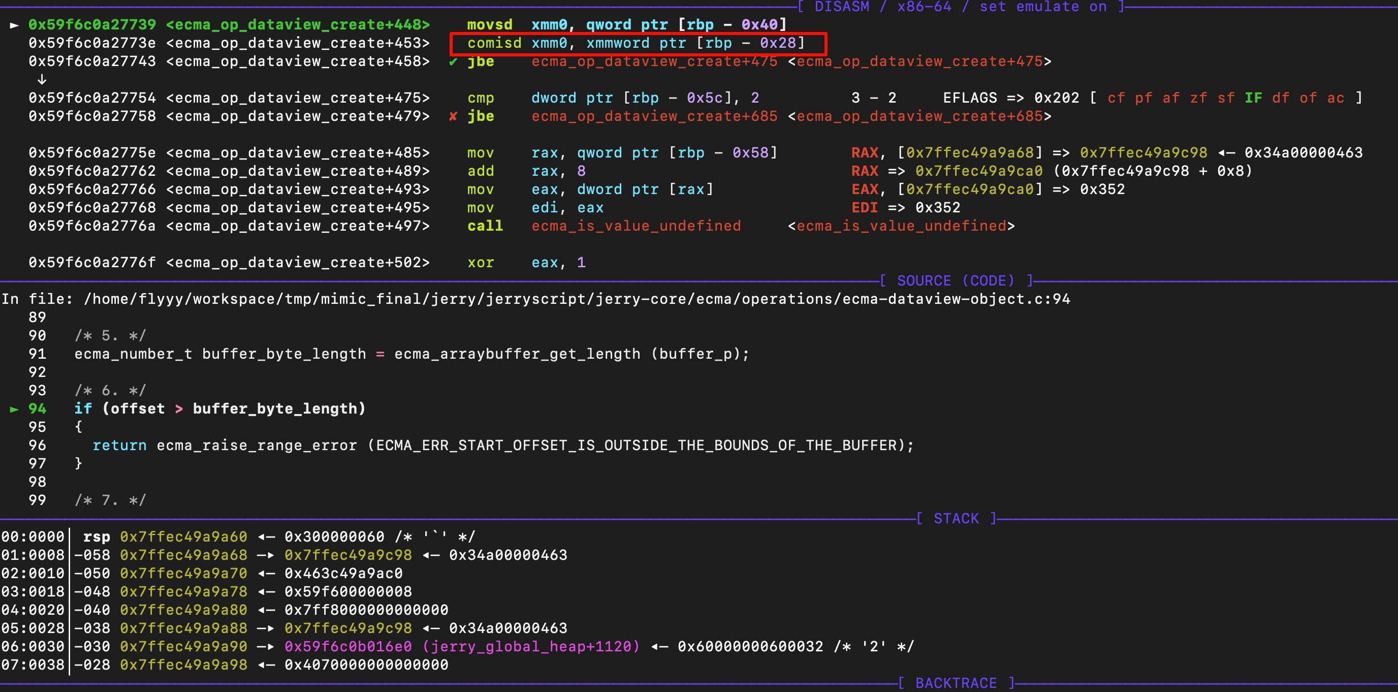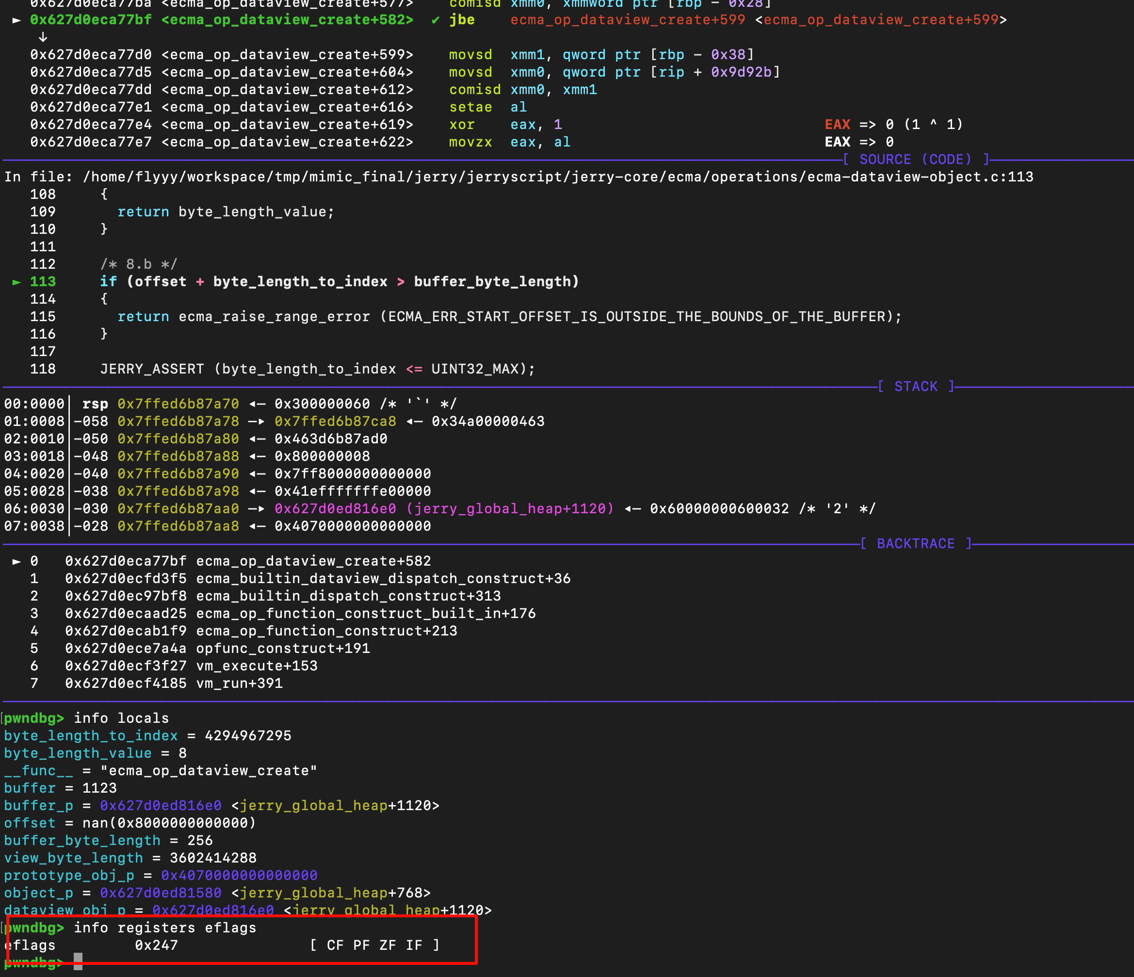 这里,我将view_byte_length设置为0xfffffff,buffer_byte_length仅为0x100,但是由于offset是nan,所以此时的eflag如下,也就绕过了bound check