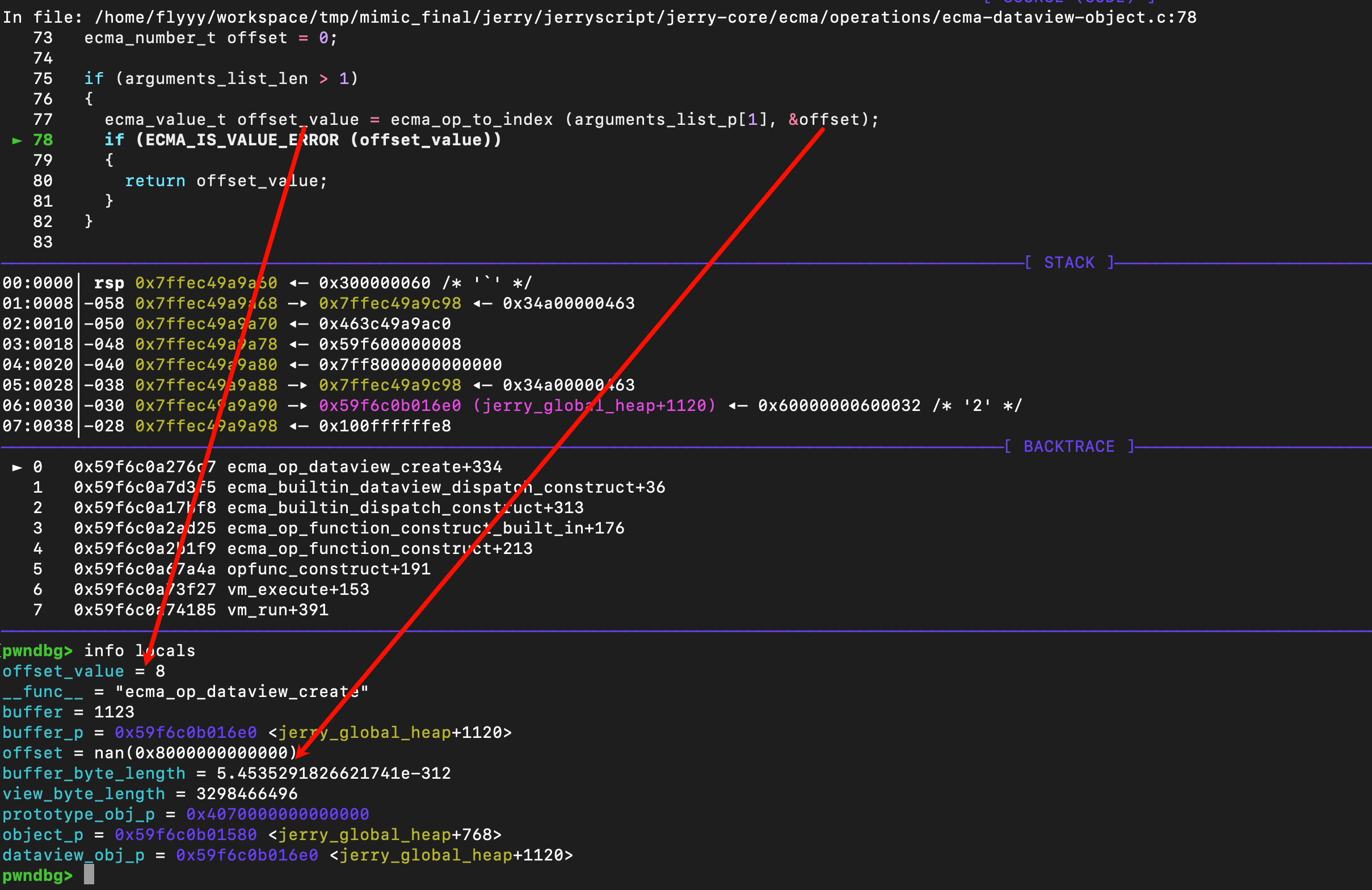 接着通过参数列表为offset赋值,同时检查是否有问题,可以看到上方[a]处调用了ecma_op_to_index,这个函数涉及到nan的处理,正常遇到nan会将nan清空为0,并返回正常的状态码ECMA_VALUE_EMPTY,但是这里没有清空,所以会正常绕过这个检查,并保留原有的nan的值