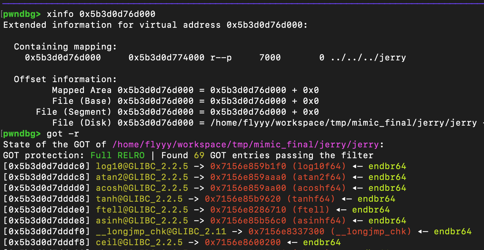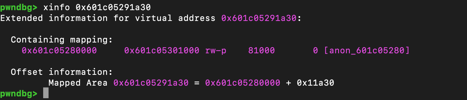 可以得到这样的一个leak,通过减去0x11a30可以得到一个段开头的地址,但是这个是随机的,根据你写的脚本和环境决定