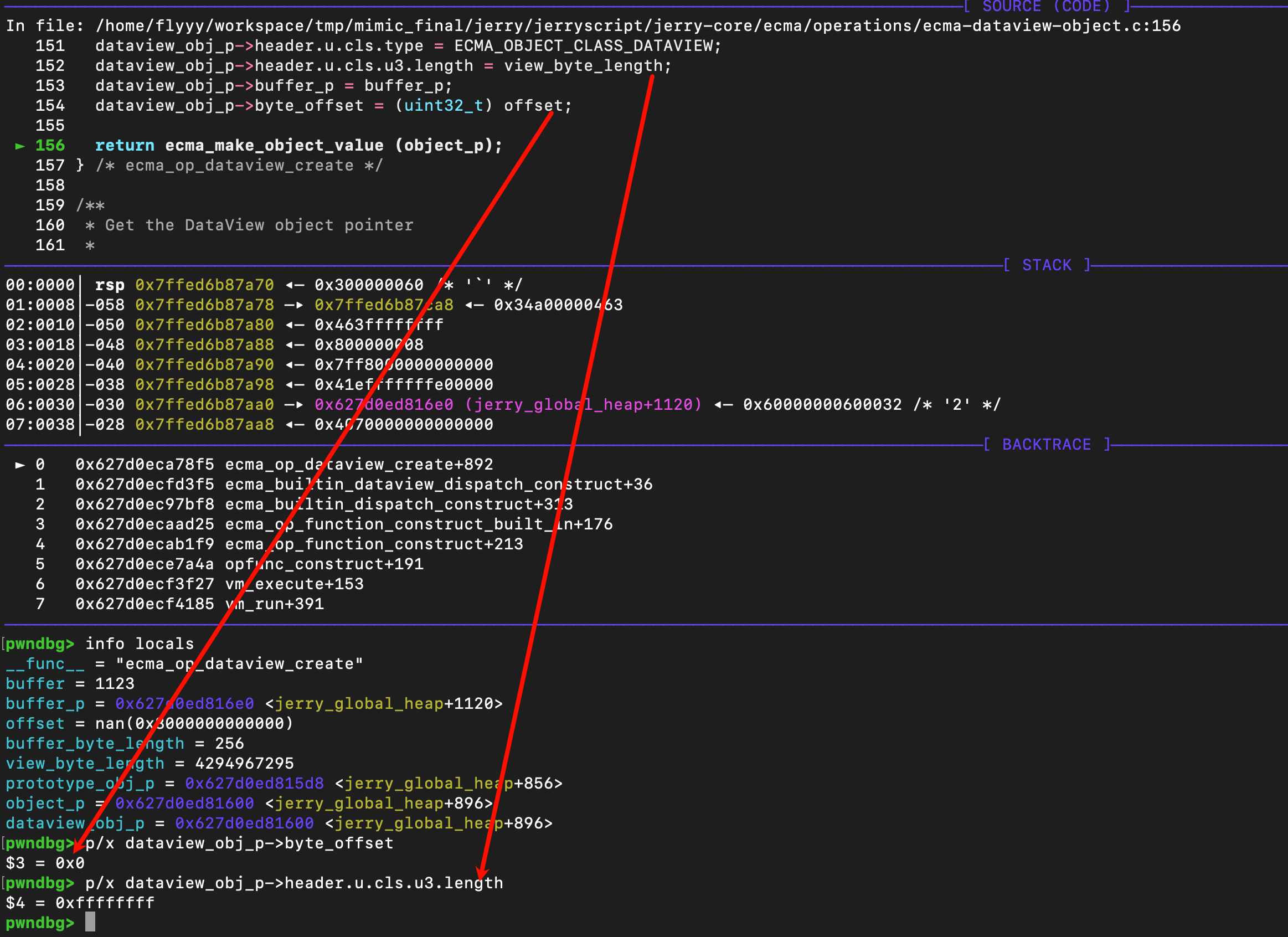 可以看到使用了ecma_extended_object_t的header,这个是对于复杂对象的header,其中集成了ecma_object_t的内容。接着又一个buffer_p指针,这个其实指向了Arraybuffer,接着是对应的byte_offset,用户索引Arraybuffer中的偏移