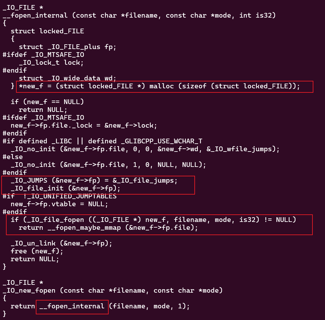 cat glibc-2.23/libio/iofopen.c,这个函数在libio/iofopen.c文件内,函数名为_IO_new_fopen,该函数直接调用__fopen_internal