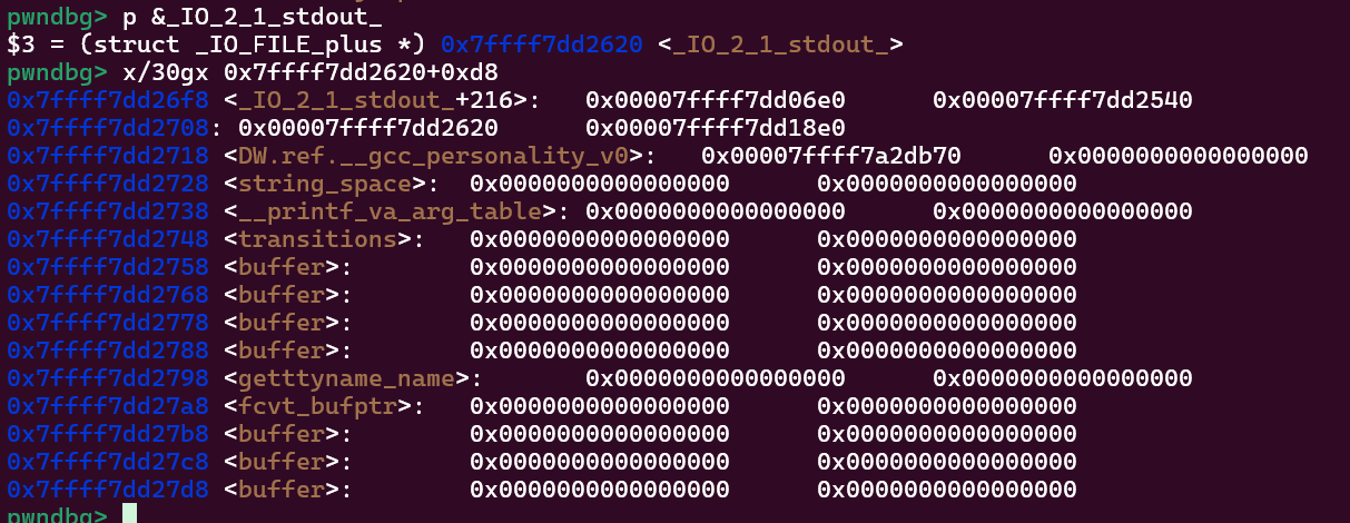 p _IO_list_all可以看到_IO_list_all是指向_IO_2_1_stderr_,而且地址位于libc.so上。注意结构体是_IO_FILE_plus,后面会说到