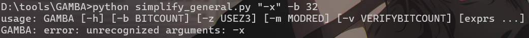 usage: GAMBA [-h] [-b BITCOUNT] [-z USEZ3] [-m MODRED] [-v VERIFYBITCOUNT] [exprs ...]