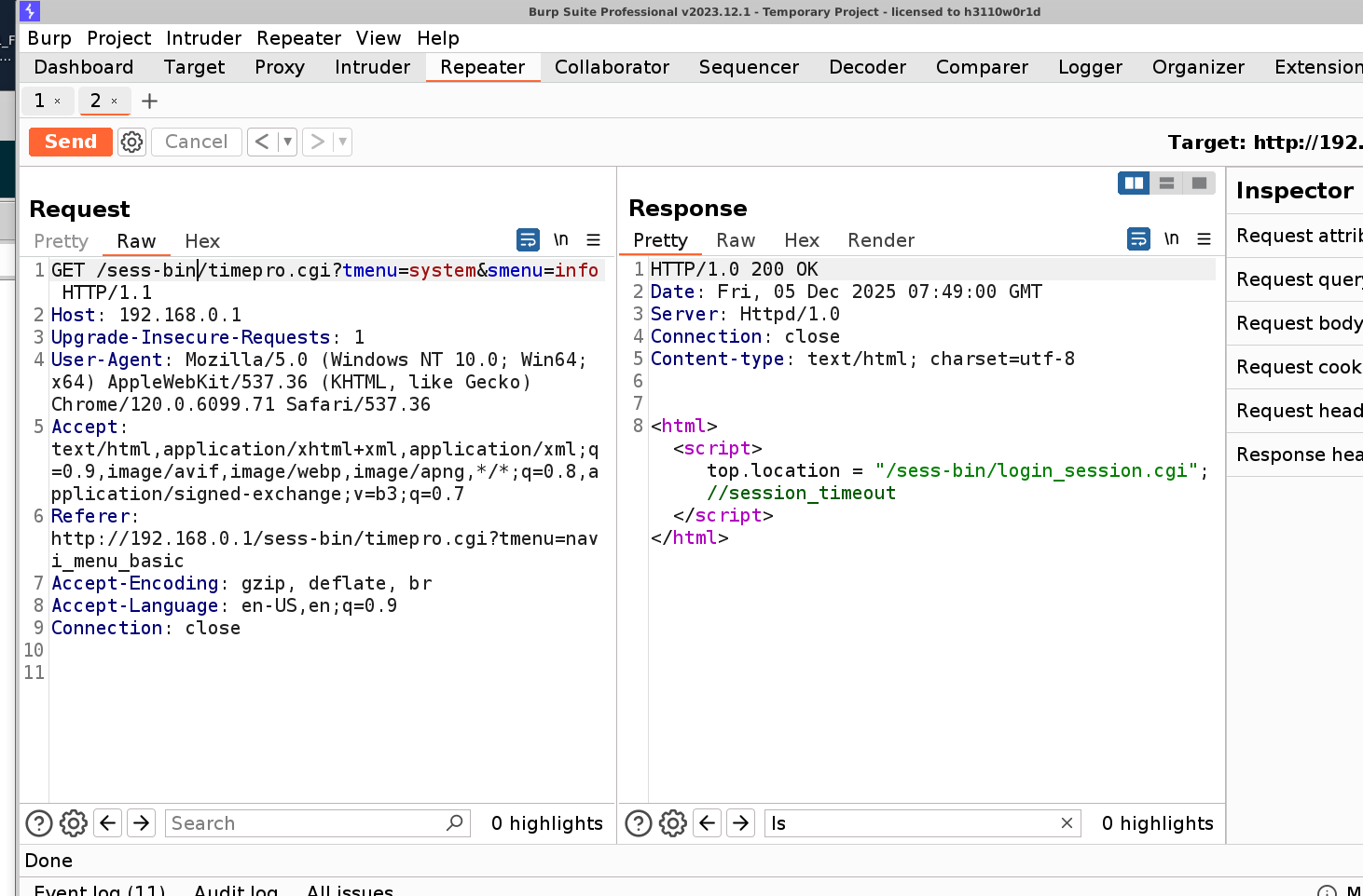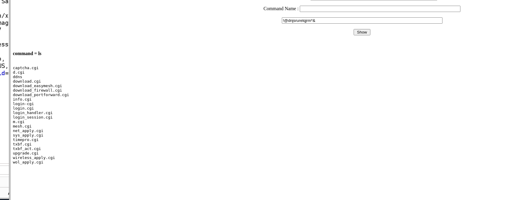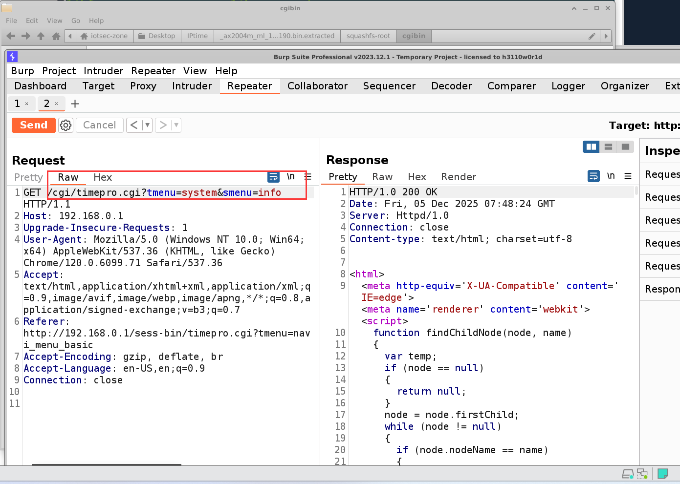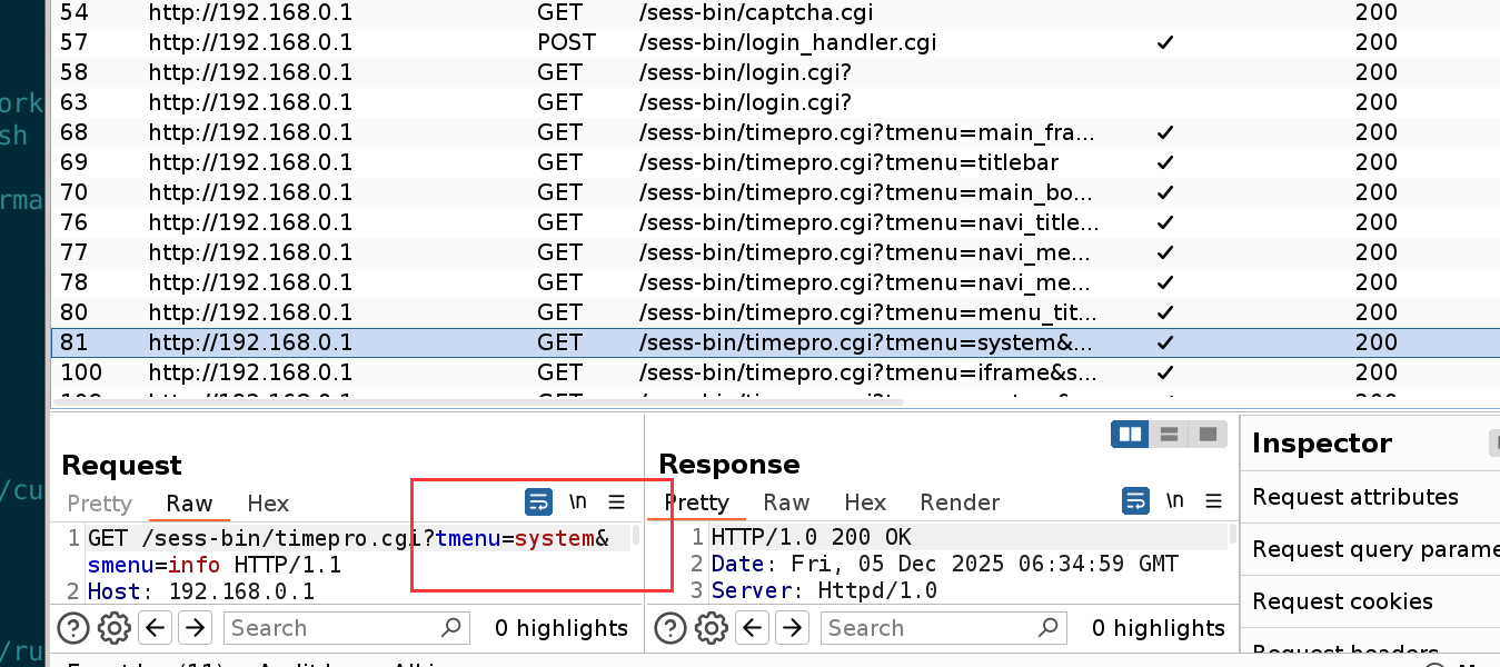 login.cgi, login-cgi 作为请求登录请求 sys_apply.cgi 应用系统设置,重启、时间等,可能会存在很多system()或execve() net_apply.cgi 网络设置、子网掩码、静态路由等,可能出现ipconfig、route等命令 wireless_apply.cgi 应用无线设置(SSID、密码、加密类型) download.cgi, download_...cgi 提供下载功能,可能有任意文件读取、目录遍历 比较重要的应该是timepro.cgi,因为我们之前的请求 /sess-bin/timepro.cgi?tmenu=system&smenu=info 就是通过这个文件进行的,很大概率会有漏洞。