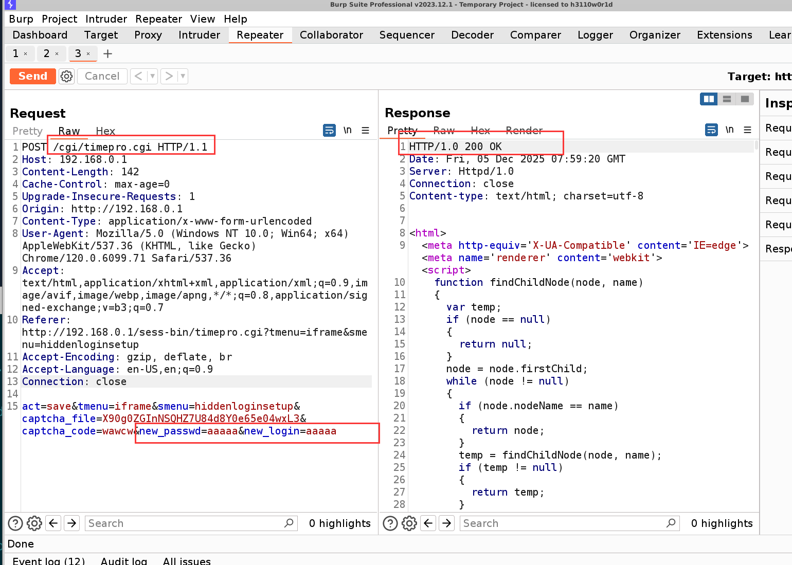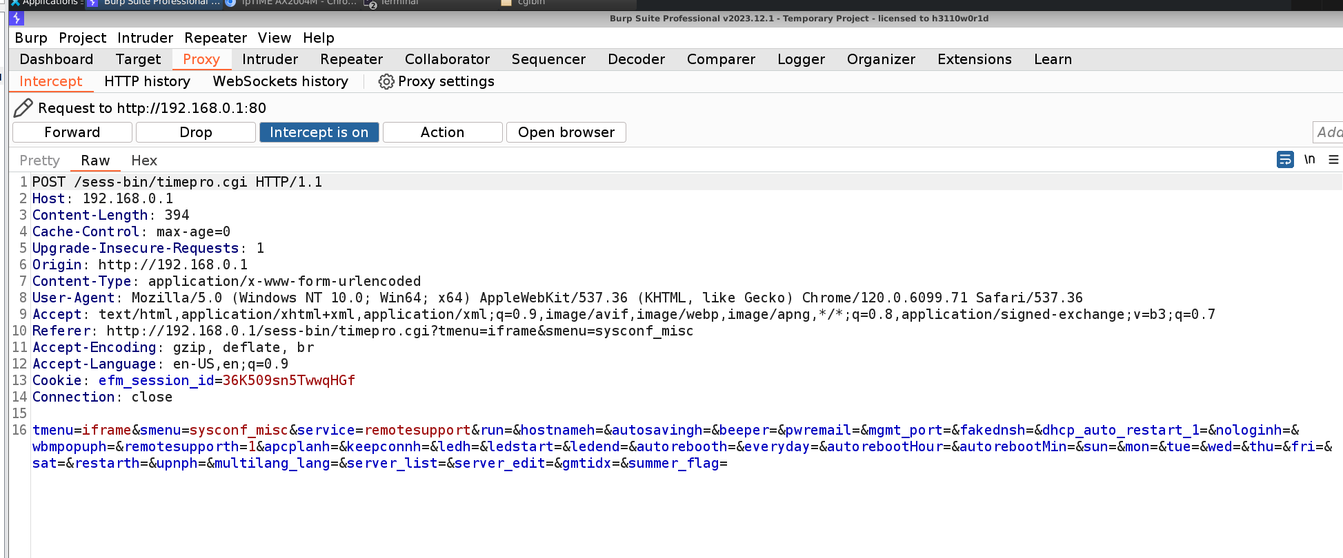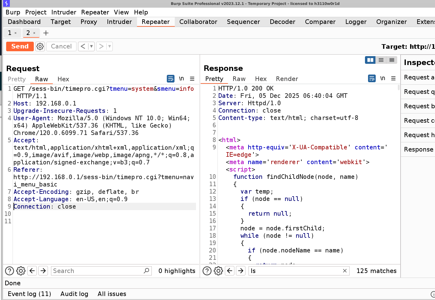 login.cgi, login-cgi 作为请求登录请求 sys_apply.cgi 应用系统设置,重启、时间等,可能会存在很多system()或execve() net_apply.cgi 网络设置、子网掩码、静态路由等,可能出现ipconfig、route等命令 wireless_apply.cgi 应用无线设置(SSID、密码、加密类型) download.cgi, download_...cgi 提供下载功能,可能有任意文件读取、目录遍历 比较重要的应该是timepro.cgi,因为我们之前的请求 /sess-bin/timepro.cgi?tmenu=system&smenu=info 就是通过这个文件进行的,很大概率会有漏洞。