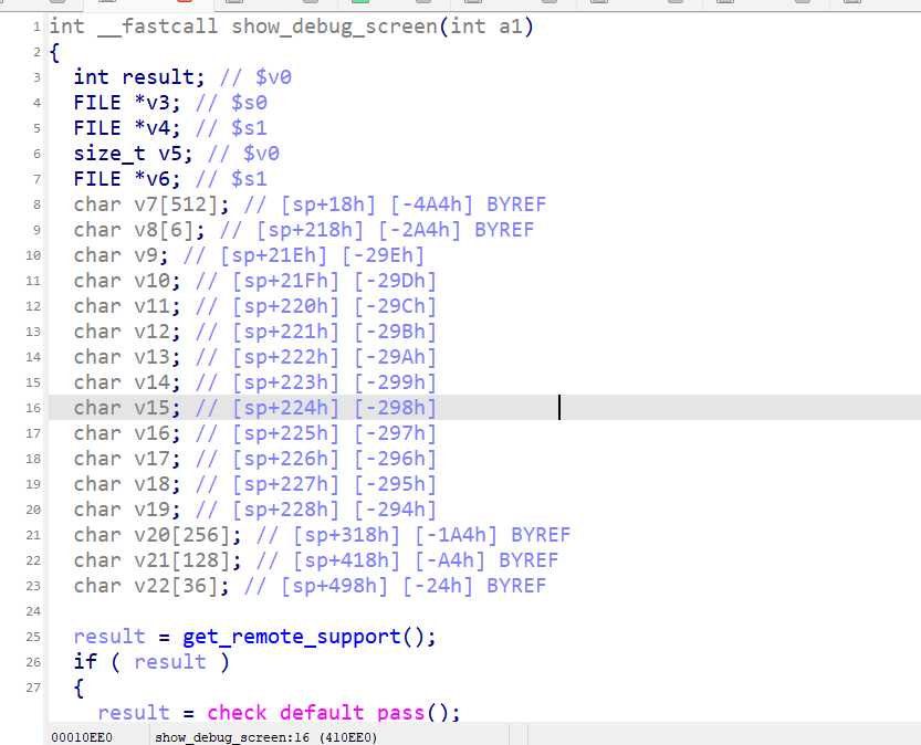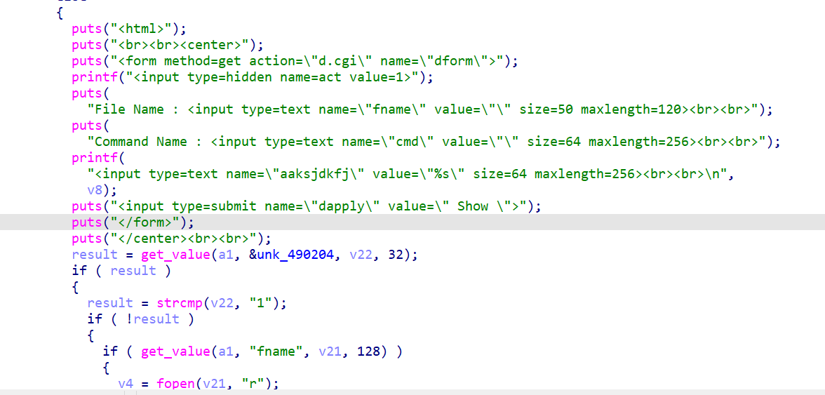 而且我们在ftext函数中发现了后门的踪迹,如果调用了这个d.cgi文件,他会检查cgi脚本的路径,路径匹配后会进入到show_debug_screen函数中再次进行判断,它会调用我们之前发现包含 aaksjdkfj 后门的密钥检查和cmd命令诸如函数。