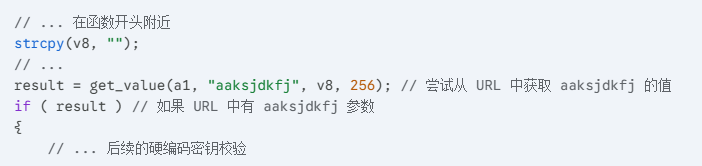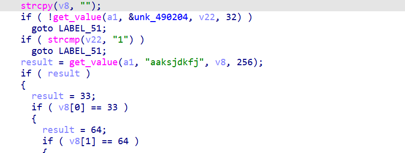 这段会确定我们没有提交了aaksjdbfj参数,那么v8的值就是空的,就是strcpy(v8,""),空字符串