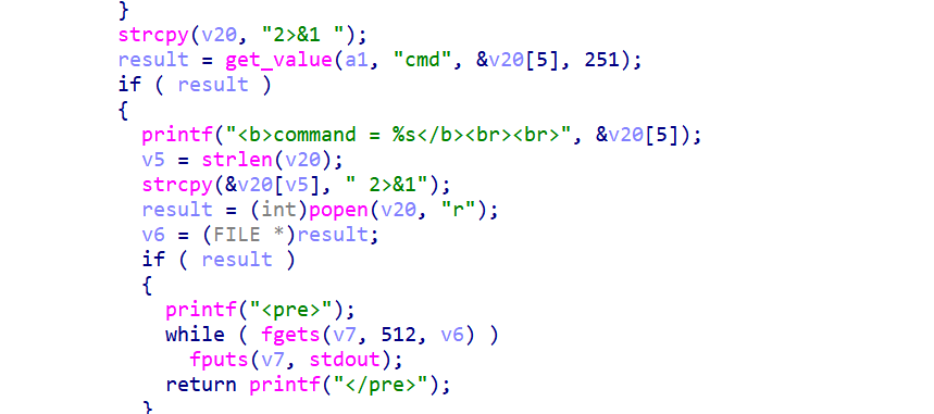 那其实就是说我们可以通过URL或POST数据包提交一个名为cmd的参数,他会存入v20中并且调用popen,或许可以尝试构造一下。