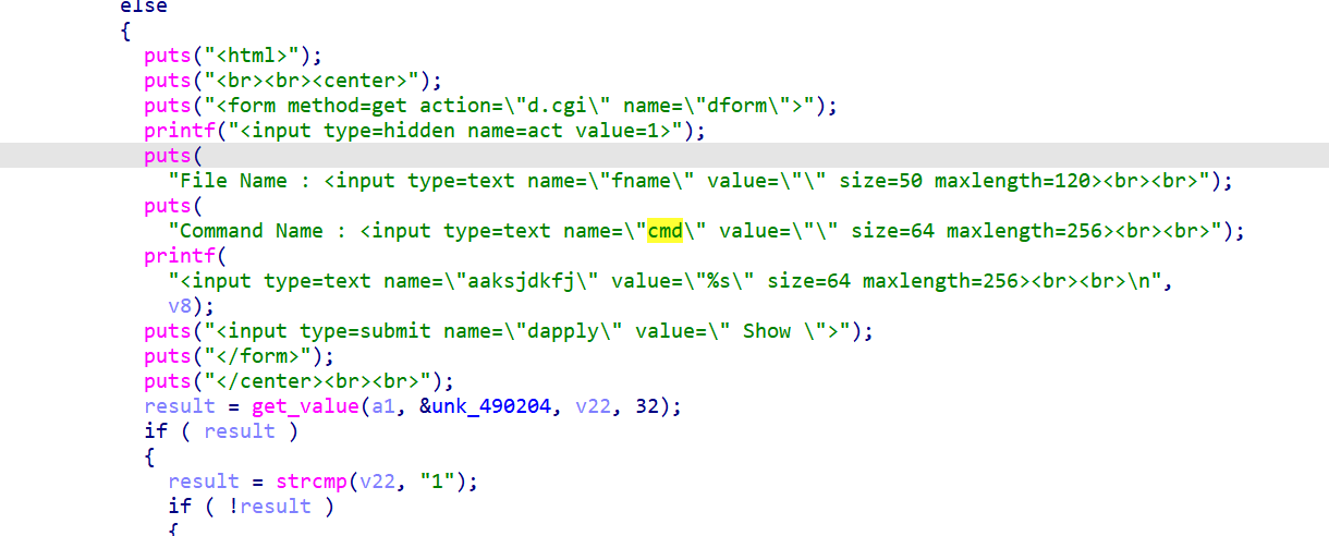 这里输入是程序调用get_value(a1,"cmd",...)获取用户输入的cmd参数,把他拼接到v20后面,然后调用popen(v20,"r")执行。这里好像是通过后门钥匙就能提交cmd=[shell],一会儿尝试一下。