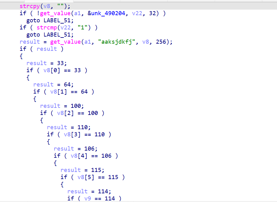 来看这一段,这里就是如果没忍住跳转到LABEL_51,如果认证了会获取aaksjdkfj值,然后检查这个值是否匹配一个字符串。